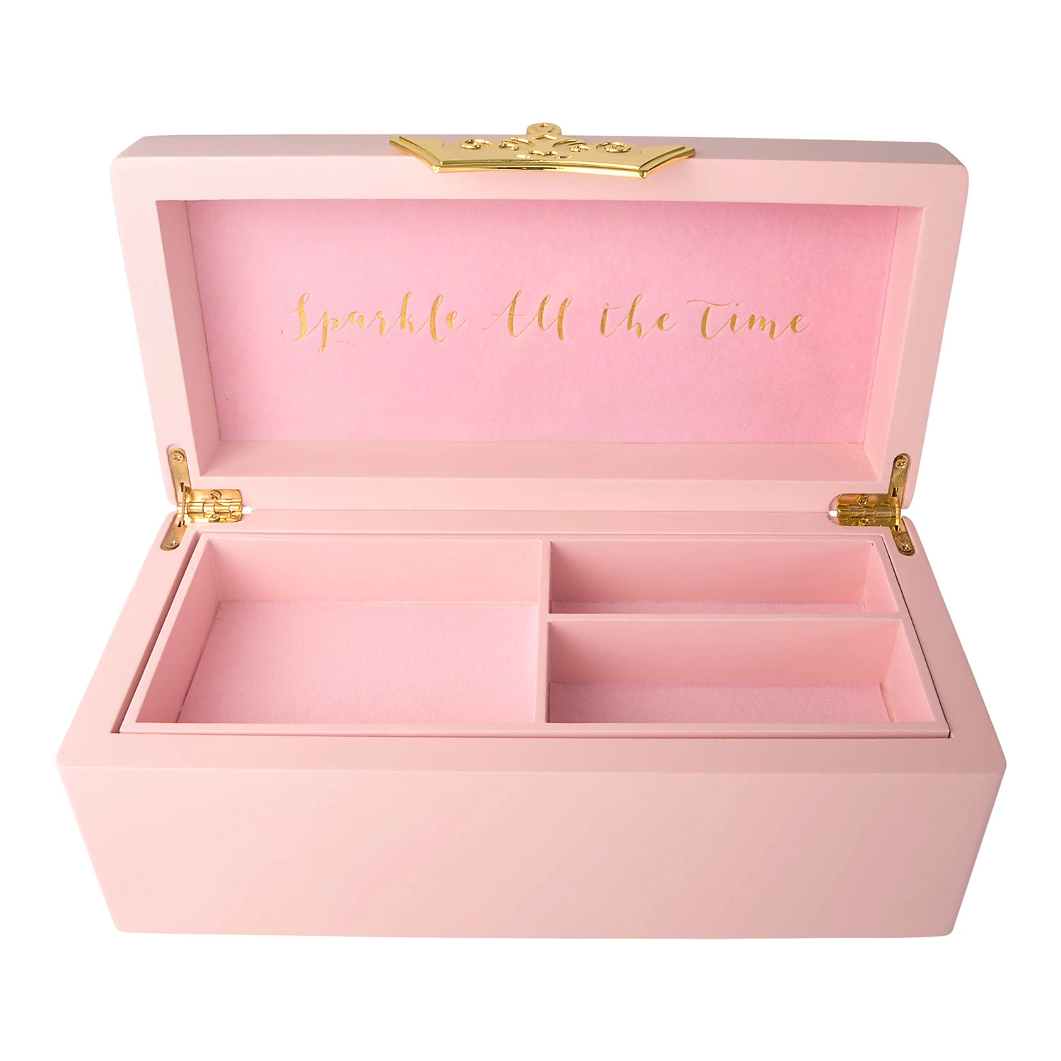Disney Princess pink wooden jewellery box. Crafted in pink lacquered wood, with a gold princess crown handle this jewellery box makes the perfect gift for any Disney lover. The inside of this jewellery case features the slogan “Sparkle All The Time” on faux suede as well as ample storage for large items underneath the removable inner tray.