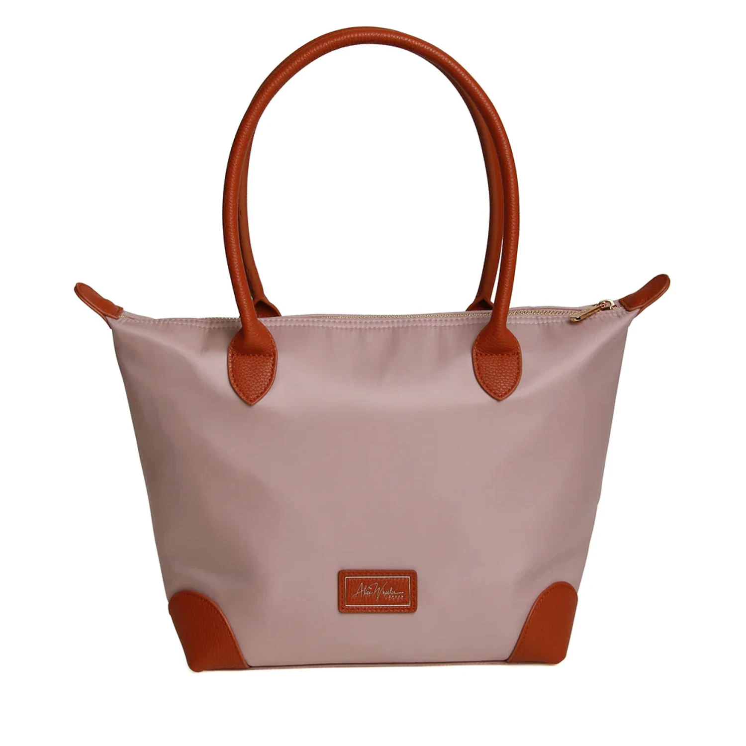 A versatile tote bag in classic pink and brown from Alice Wheeler. Crafted in super lightweight material with tanned vegan leather accents and designed to foldaway. The bag has a generous compartment, with metal zipped fastening for added security, the compartment is fully lined and includes a large internal zipped pocket and further pockets for keeping all essentials in order. Engravers Guild will emboss the recipient’s initials to make this bag extra special.