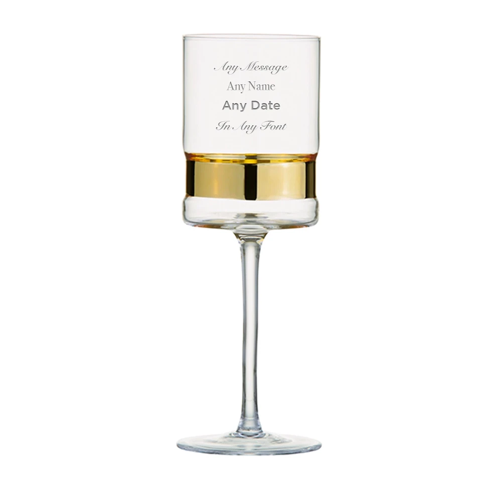 Sophisticated wine glass with a striking gold band from Anton Studio Designs. This stunning glass is a unique and distinctive gift for the modern wine drinker, perfect for regular use or as decorative tableware. Add a personalised message of your choice to make it extra special. Precision laser engraving cuts a beautiful impression making the gift personal.