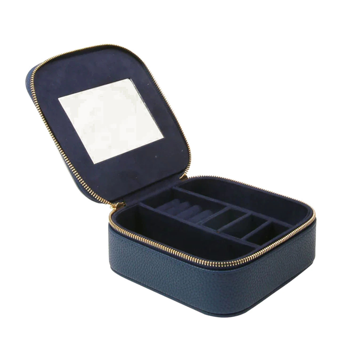 A travel Jewellery box in a contemporary navy colour. This compact jewellery box is perfect to look after all your precious items, with ring rolls, a large section for bigger bits of jewellery as well as a mirror on the lid. Made from faux leather, this box is lined with faux suede for that extra touch of luxury. Have the initials of the recipient embossed on the box by Engravers Guild to give that extra special touch.