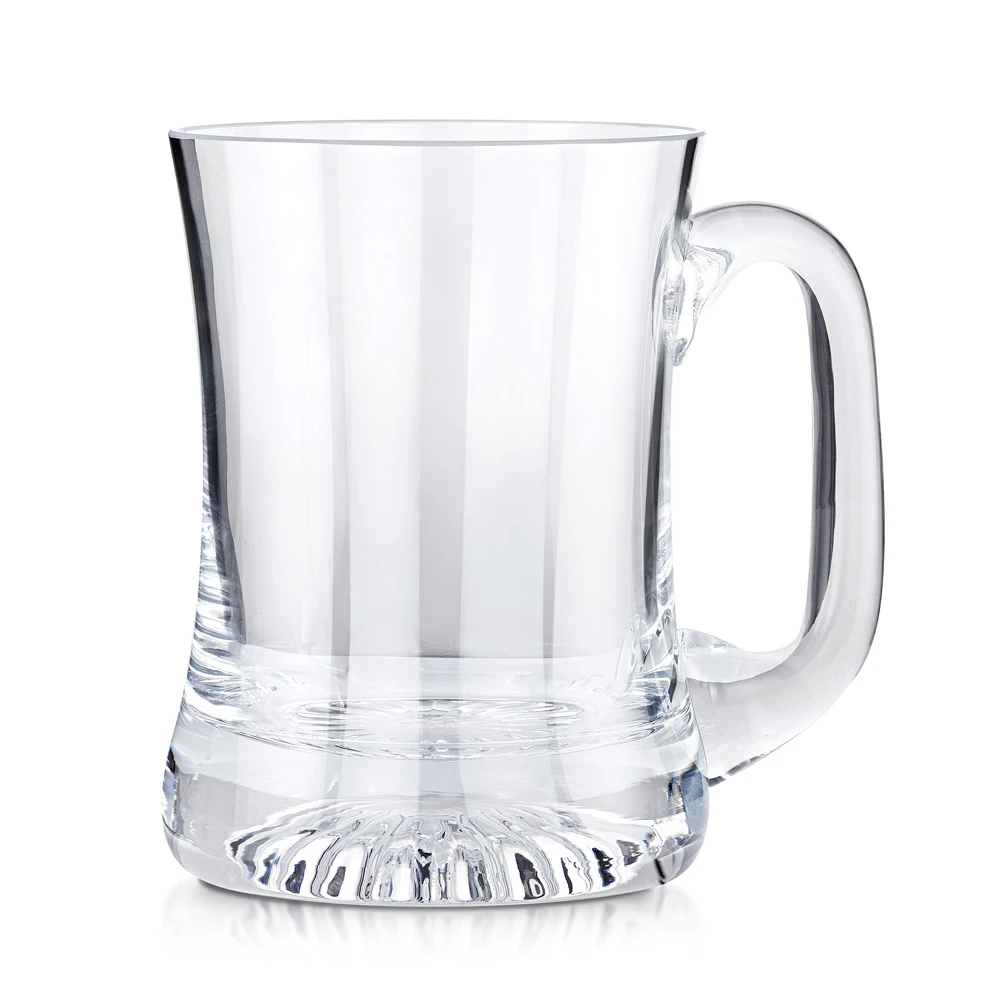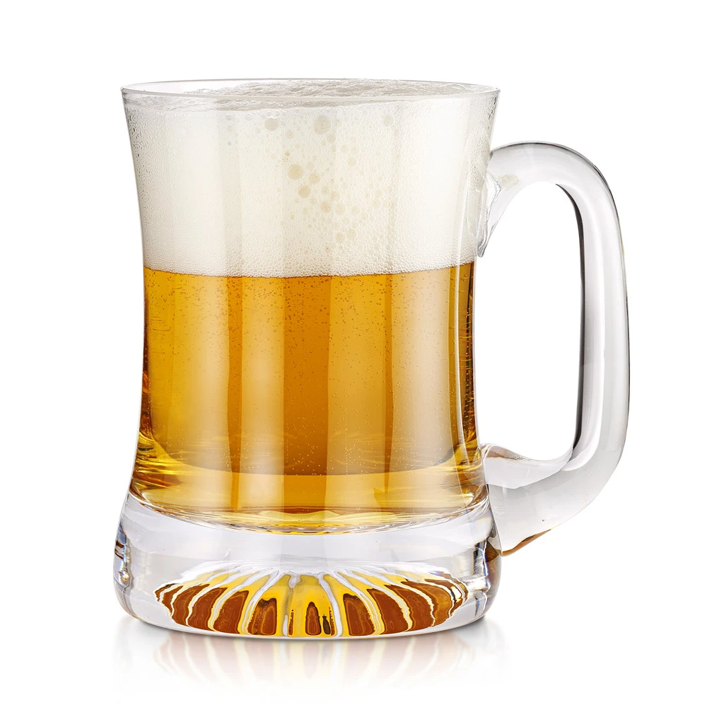 Waisted glass beer tankard, featuring a radial star on the bottom. This tankard is a classically designed piece which has been mouth blown and hand crafted in order to create a wonderful drinking experience. In the base of this tankard, lies a star made of thick set glass. Precision laser engraving cuts a beautiful impression with a message of your choice.