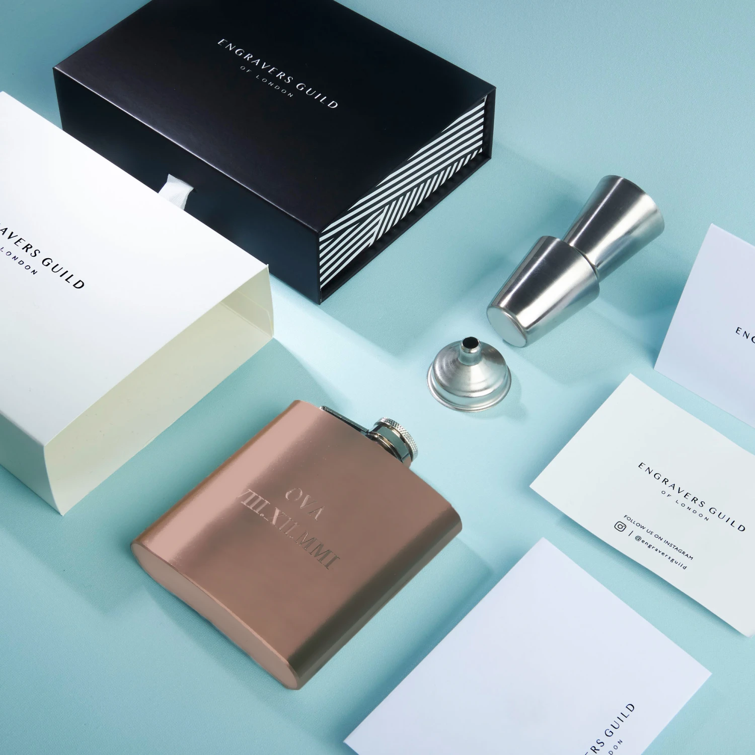 The 6 oz engraved hip flask measures 11cm high by 9 cm wide and is delivered in a stunning luxury gift box with a gift card. A pouring funnel is included.