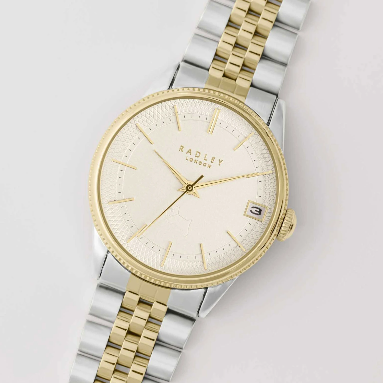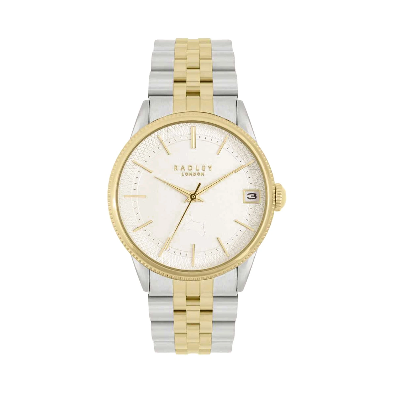 Engraved ladies watch from Radley with stainless steel and gold plated stainless steel bracelet strap. The doggy motif is crisp against the clean white dial, while the two tone bracelet strap brings a contemporary elegance.