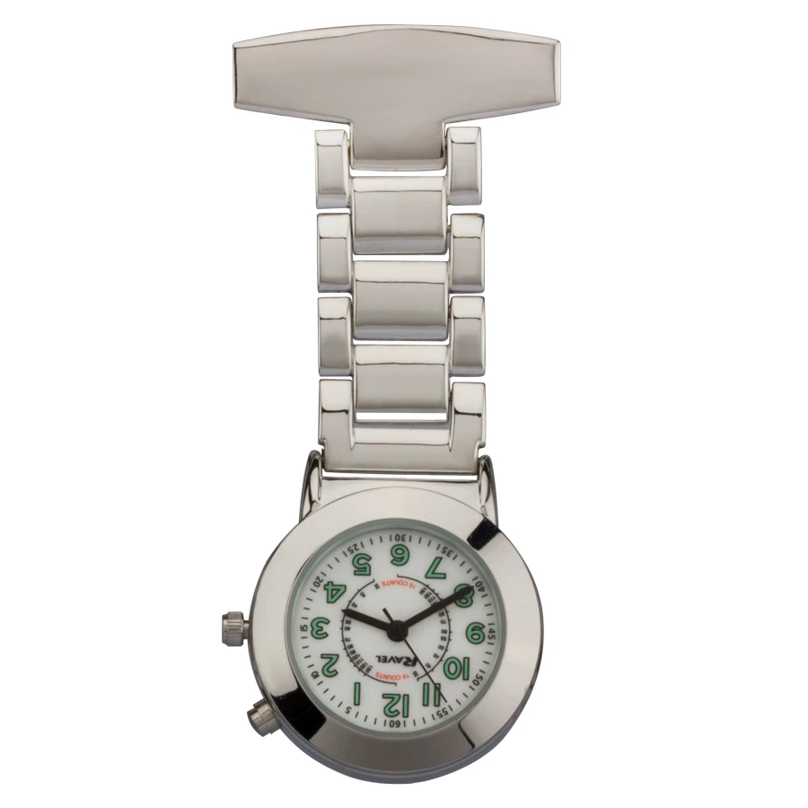 Silver personalised nurses watch from Ravel with backlight. Ideal for those nurses who work all hours, this fob timepiece has a push-button option to illuminate the dial and make easy-going of reading the hour in dark settings. The face of the watch also features fluorescent numbers in normal light conditions.