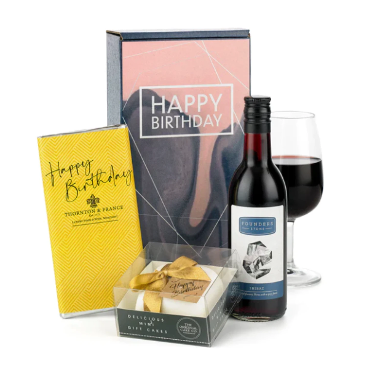 This delightful wine package is designed to celebrate their birthday, tailored perfectly for one. This petite hamper brings together a merlot red wine, a personalised wine glass, an iced fruit cake and a special birthday chocolate bar. Itβs a charming way to make their day extraordinary.
