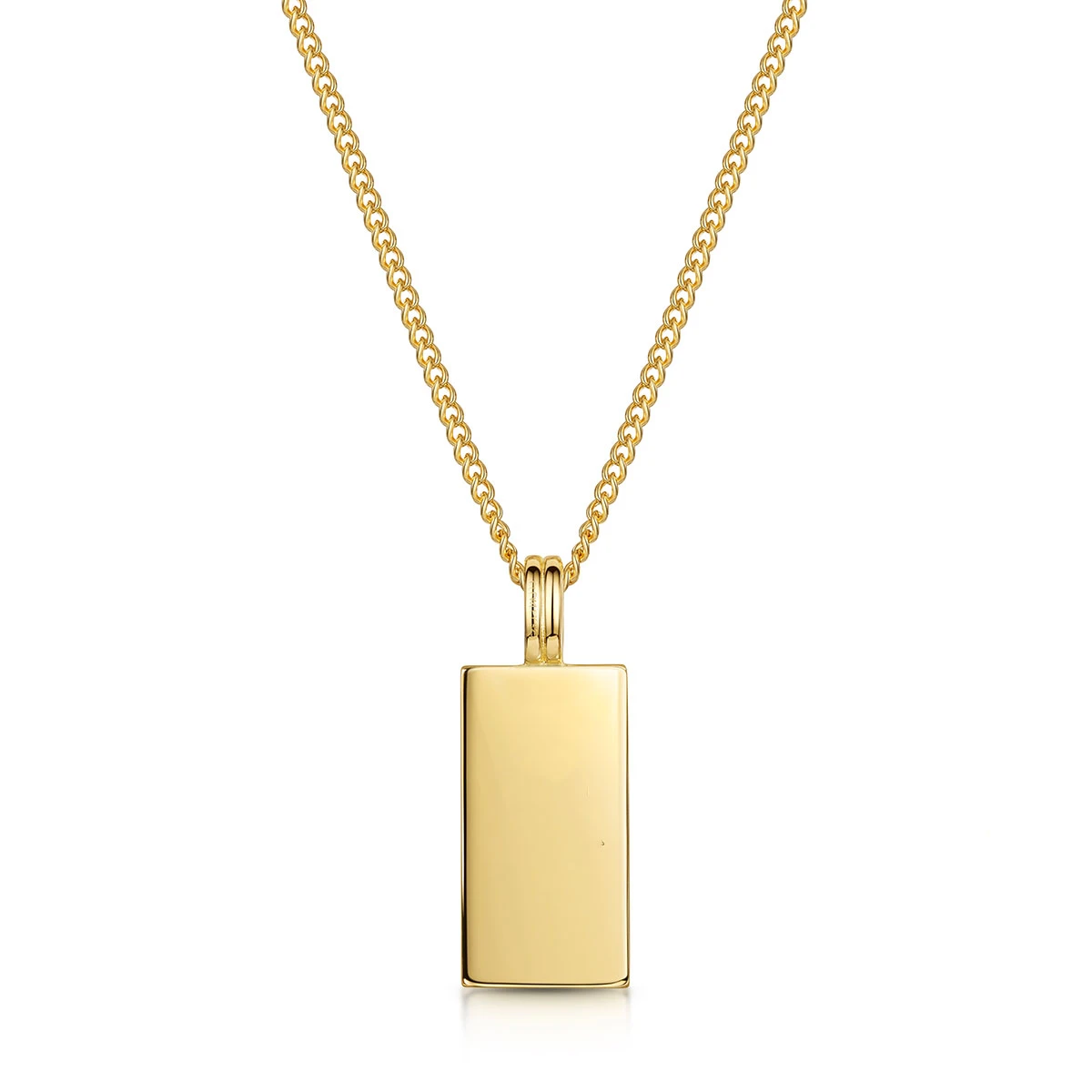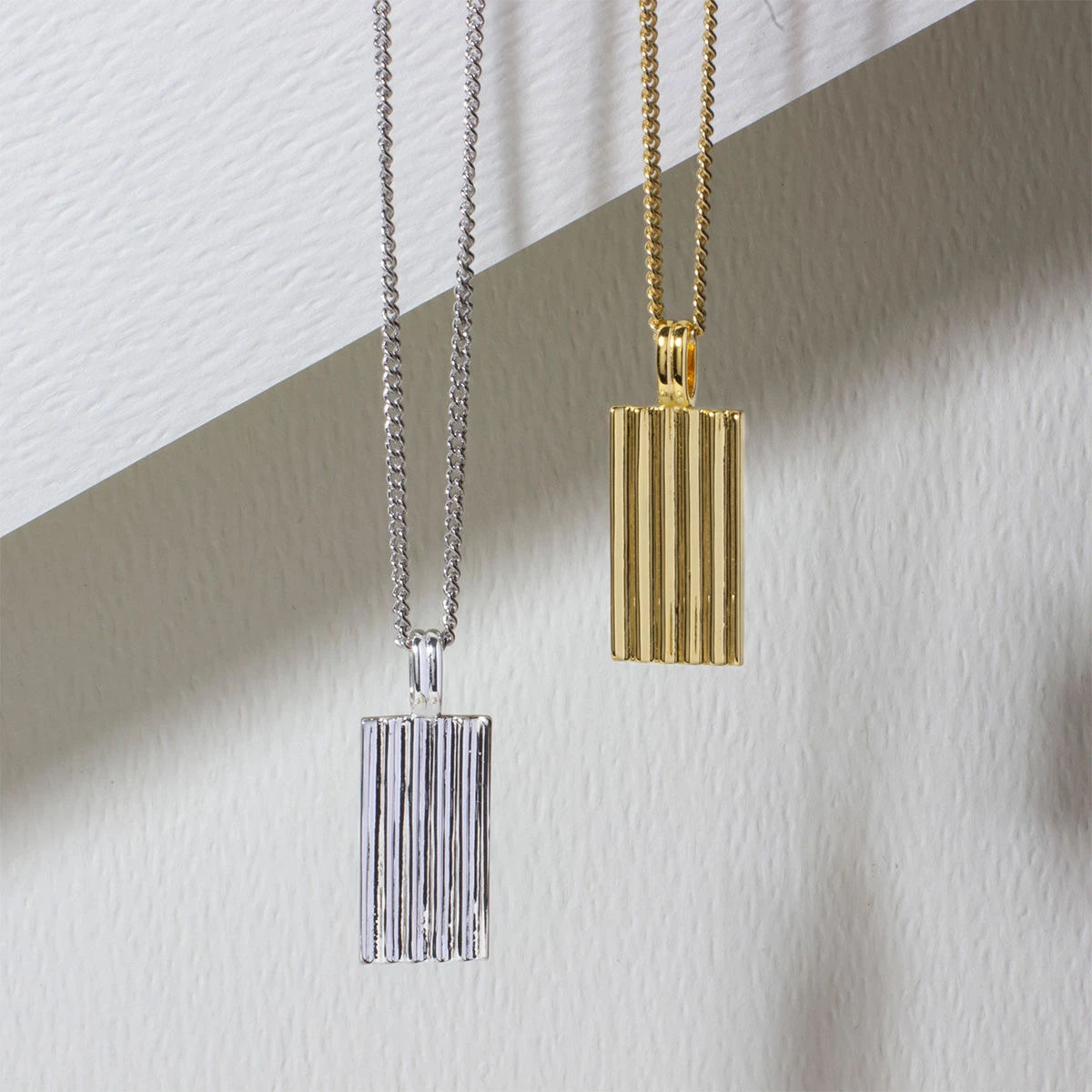 A striking piece with dynamic texture, the Ripple Necklace and chain from Clewley are crafted from 925 sterling silver plated with 18K gold. This rectangular pendant features a unique undulating ripple effect running seamlessly from top to bottom, symbolizing the eternal ebb and flow of the sea.