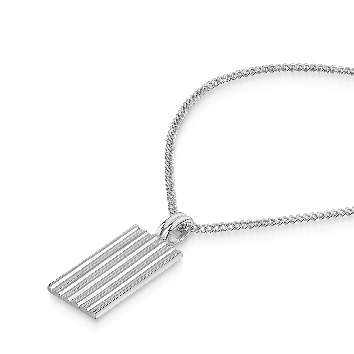 A striking piece with dynamic texture, the Ripple Necklace and chain from Clewley are crafted from 925 sterling silver. This rectangular pendant features a unique undulating ripple effect running seamlessly from top to bottom, symbolizing the eternal ebb and flow of the sea.
