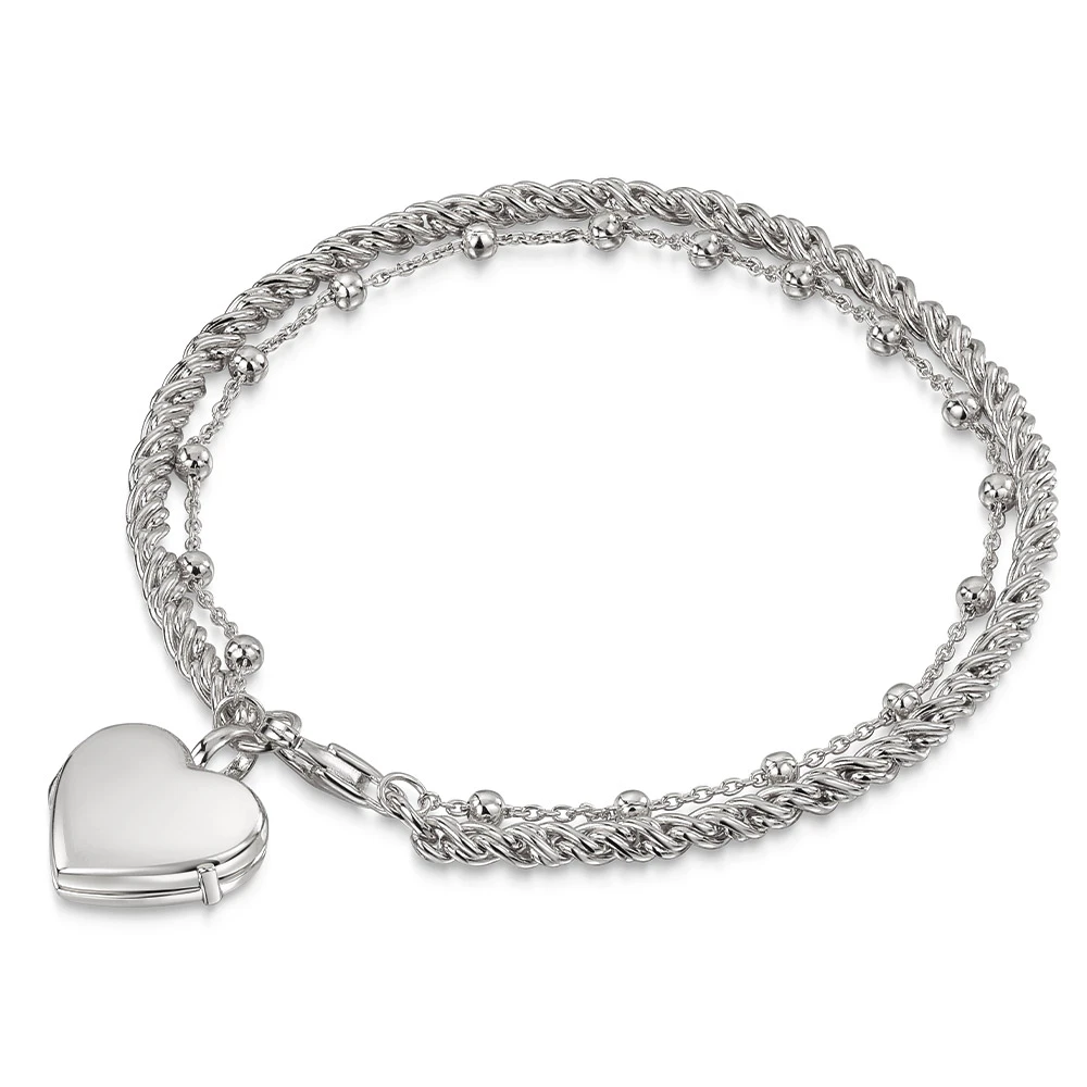Solid 925 sterling silver heart locket bracelet from LOVELOX, featuring a double rope and bobble chain. This bohemian inspired bracelet mixes and matches two traditional styles to deliver a piece full of individuality and charm. Finish the item with a personal engraving and upload two precious photos to create a very special gift.