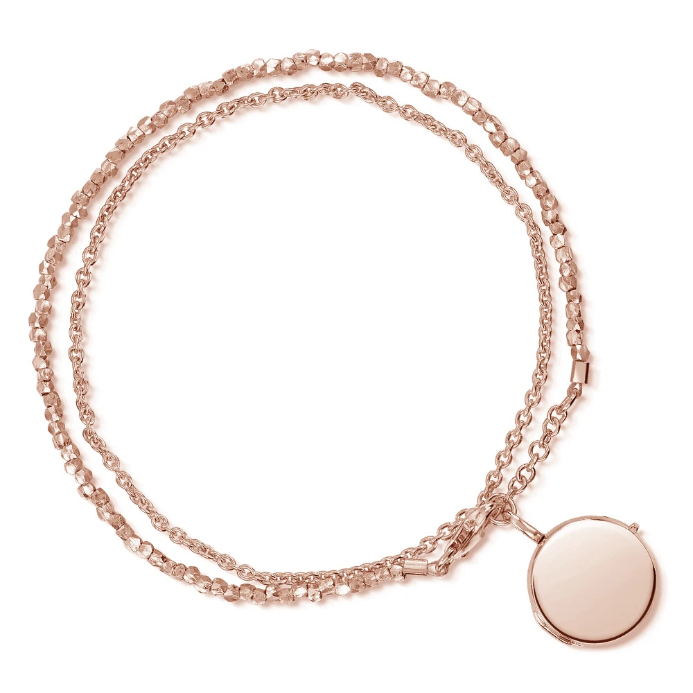 Solid 925 sterling silver round locket bracelet with 18K rose gold plating from LOVELOX, featuring a string of silver nuggets and tracer chain. Raw and natural forms of the precious metal in the chain bring a more organic sense to this bracelet, offering a fresh interpretation of the traditional locket. Finish the item with a personal engraving and upload two precious photos to create a very special gift.
