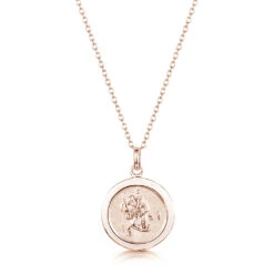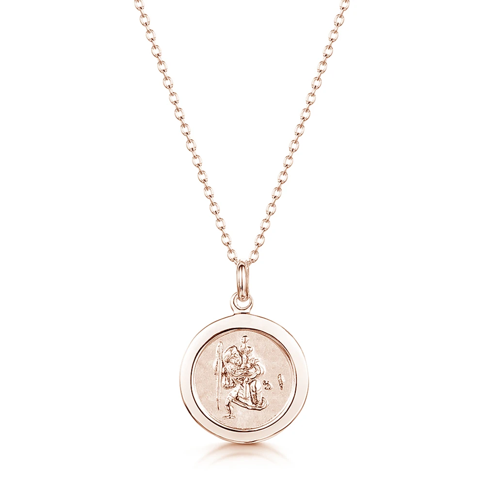 Rose Gold plate on solid sterling silver personalised St Christopher’s necklace from MYRI London. This delicate piece is designed to bring safe passage to all who travel, featuring the patron saint on the front and offering the full area of the disc on the back for expert personalisation by Engravers Guild of London.