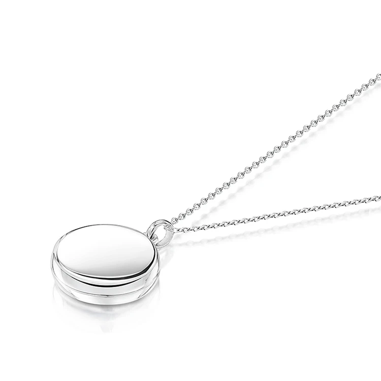 The engraved silver locket measures 18mm in diameter, with the solid silver chain running 18 inches long.
