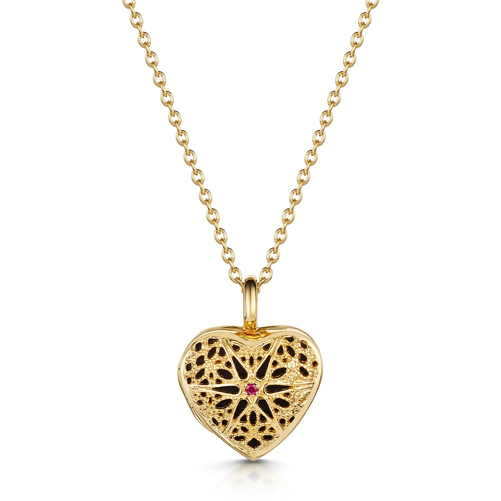Heart filigree locket in solid 925 sterling silver with 18k gold plate, featuring ruby stone. This locket showcases beautiful workmanship, displaying a radial hexagonal design and working towards a real ruby stone in the centre. Inspired by some of the Victorian pattern-work of the 19th century, this locket boasts a thoroughly modern styling alongside a sensibility for its heritage.