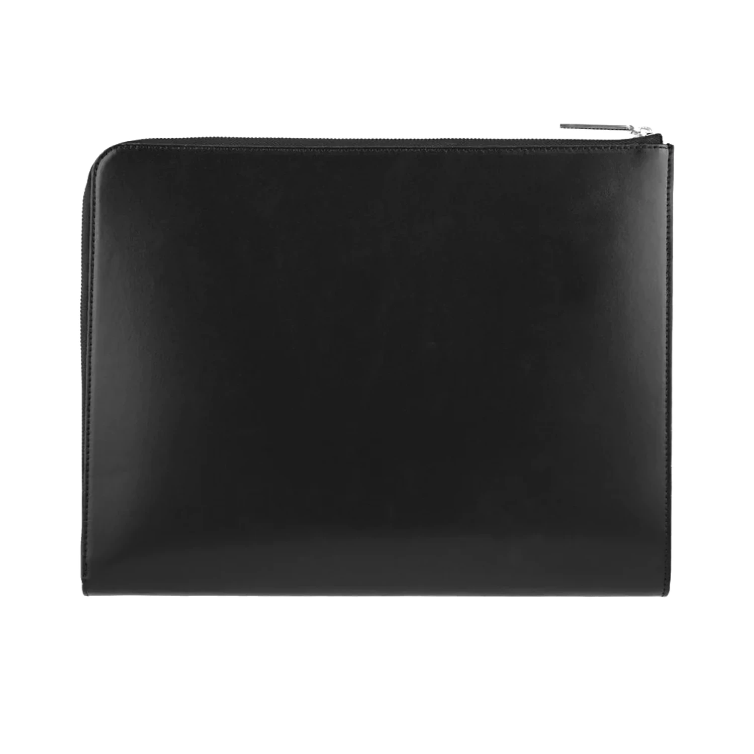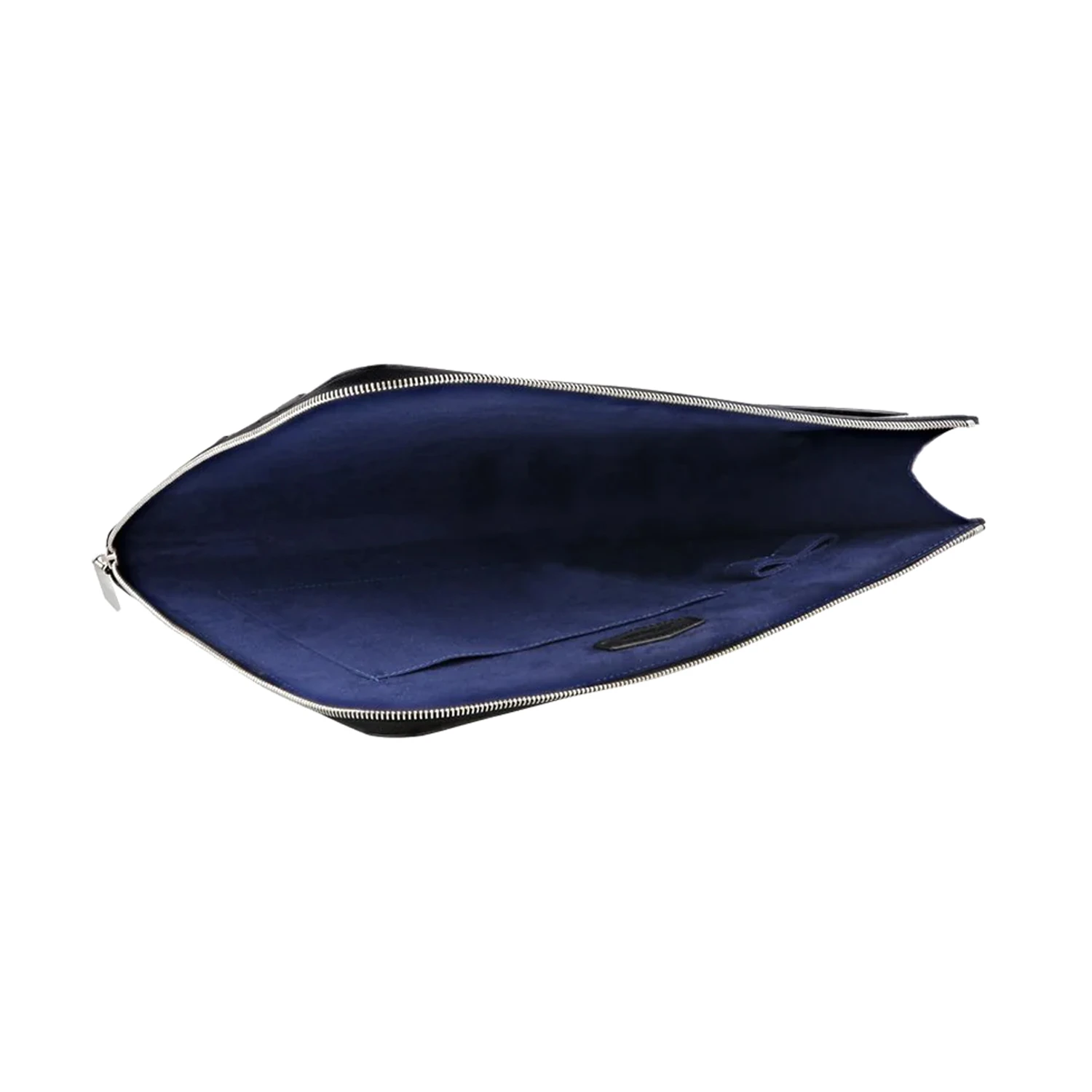 Embossed A4 sized leather zip-up folder, from S.T. Dupont, Paris. Crafted from premium quality leather and lined in a sleek navy leather, this folder is designed to keep your documents and essentials organised in style. The wide zipped opening allows for easy access to your belongings, while the compact size makes it perfect for carrying in hand or placing in a larger bag. The internal functionalities of this folder include two pen loops and a middle-sized open pocket, providing ample space for your writing instruments and other essentials. The external functionalities include a large flat pocket, which is perfect for storing your phone, keys, or other small items.