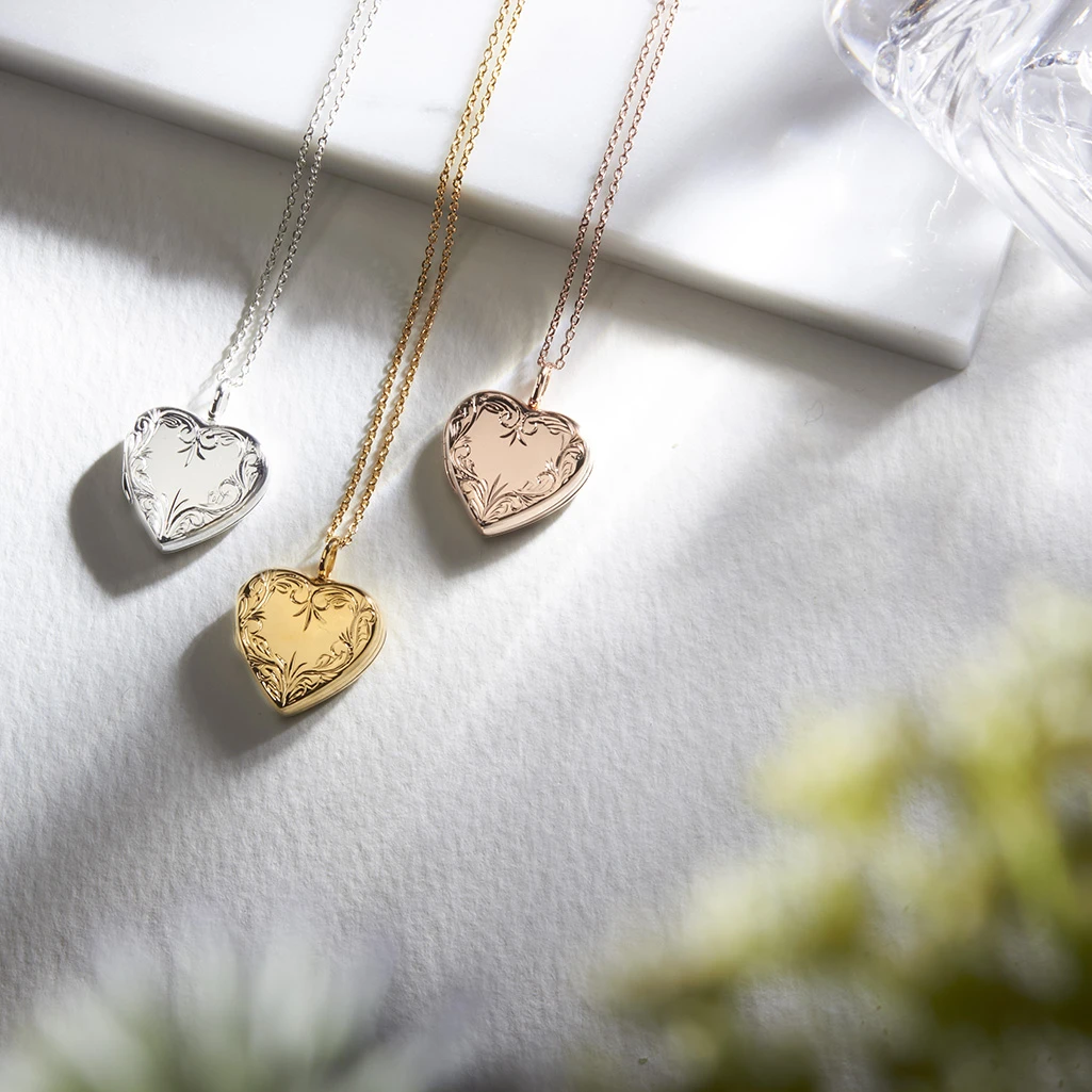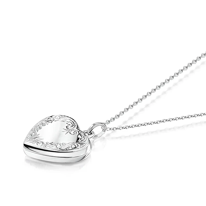 Solid sterling silver personalised locket from LoveLox, finished by Engravers Guild of London. The scroll embellishment on the front of the locket is carried out by hand, showcasing the skill of the craftsmanship and making a very special item. The form of the piece is exquisite, with the hinge seamlessly flowing into the shape of the heart, and the necklace is hand polished to a brilliant gleam.