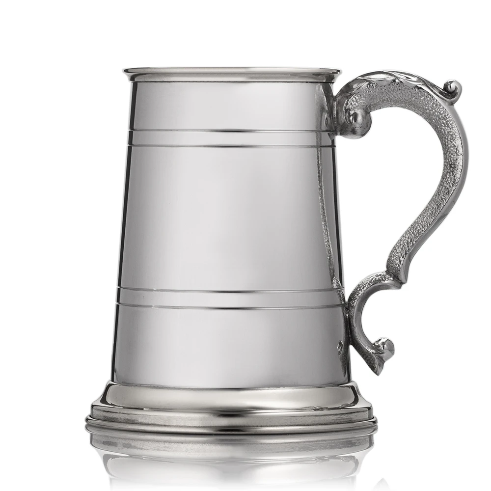 1 Pint Pewter Tankard, expertly personalised by Engravers Guild of London. The clean lines of the piece provide a contemporary feel, which is contrasted by the more elaborate Georgian-style scroll handle to bring a unique feel. The tankard is made by the English Pewter Company in the UK and the mirror-like polished finished is perfect for engraving custom messages.