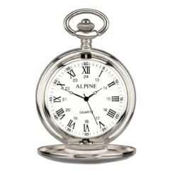 The pocket watch measures 45mm in diameter and is powered by a quartz battery movement. Chain for engraved pocket watch is included.