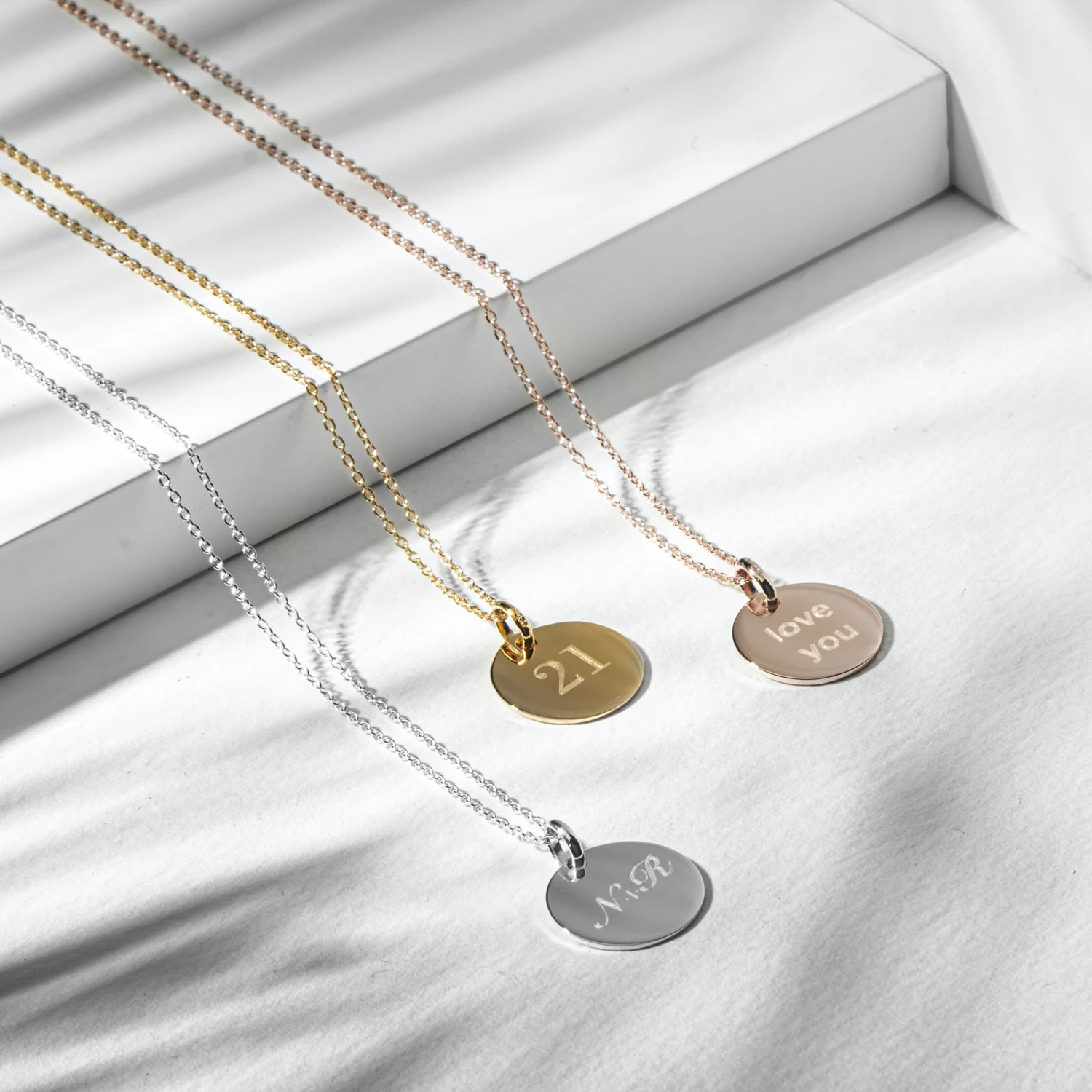 Solid 925 sterling silver personalised necklace with pendant disc. Simple in design, though exquisite in its finish, this custom necklace from MYRI London is a go-to piece in ladiesβ jewellery boxes. The design delights with its clean lines and showcases the flawless craftsmanship to offer a remarkable piece. With a quality touch and beautiful presentation, this is a gift which will be adored for very many years.