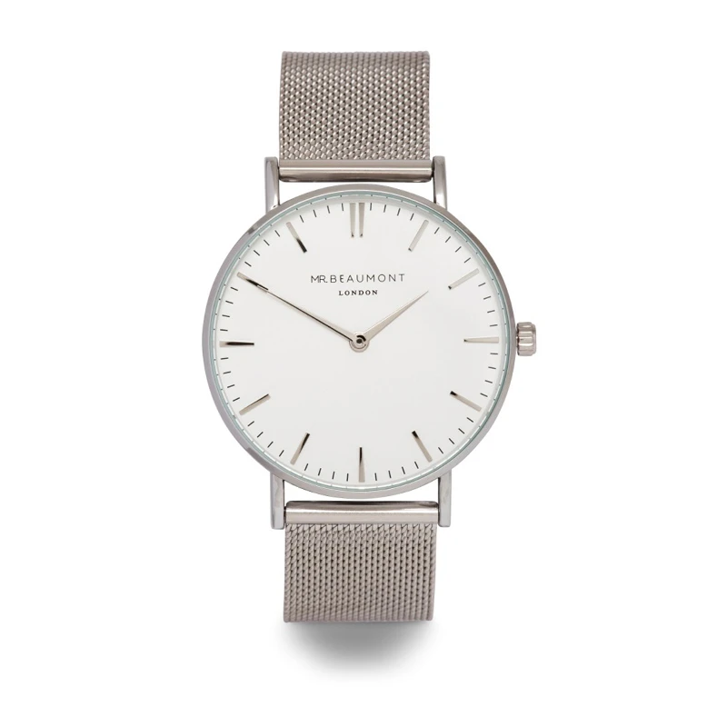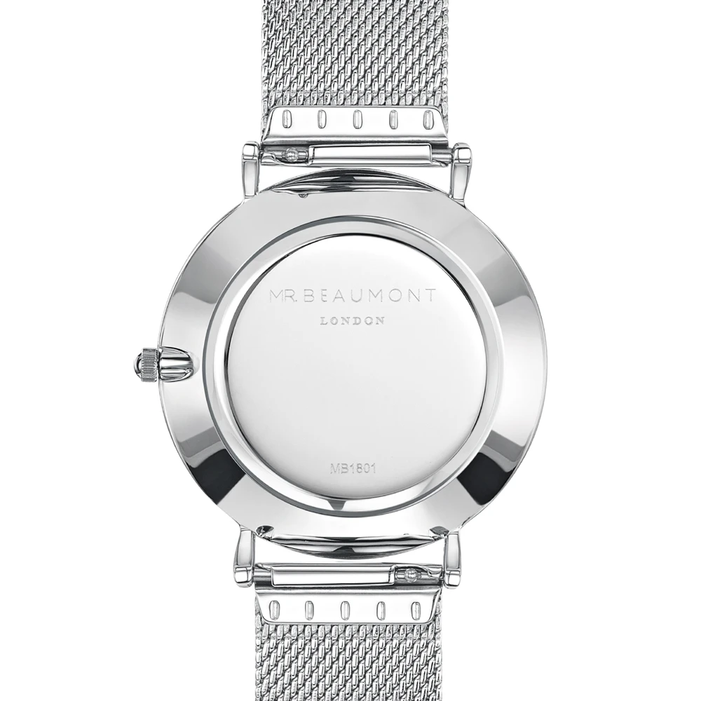 Engraved watch from Mr Beaumont with iconic mesh band in polished silver. This gent’s timepiece features a large 41mm case with a precision Japanese Miyota movement, a durable metal strap and water resistance to 3 atmospheres. Delivered in Mr Beaumont signature packaging with a brown leather cover, the watch delivers a masculine and stylish gift experience.