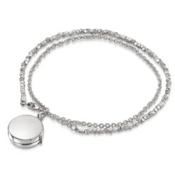 Solid 925 sterling silver round locket bracelet from LOVELOX, featuring a string of silver nuggets and tracer chain. Raw and natural forms of the precious metal in the chain bring a more organic sense to this bracelet, offering a fresh interpretation of the traditional locket. Finish the item with a personal engraving and upload two precious photos to create a very special gift.