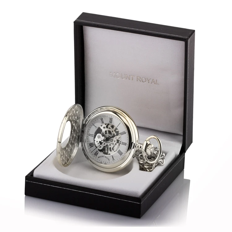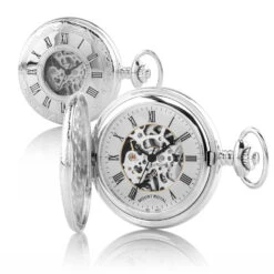Silver plated half hunter mechanical pocket watch with skeleton case from the Mount Royal collection. This timepiece features a window in the front case encircled by dark roman numerals which are then embellished by a scroll design. Exterior strong lines and classic proportions offer masculine sensibilities which balance with the intricacy of the movement on display inside. Meanwhile, the traditional diamond-cut engraving brings a special and personal touch.