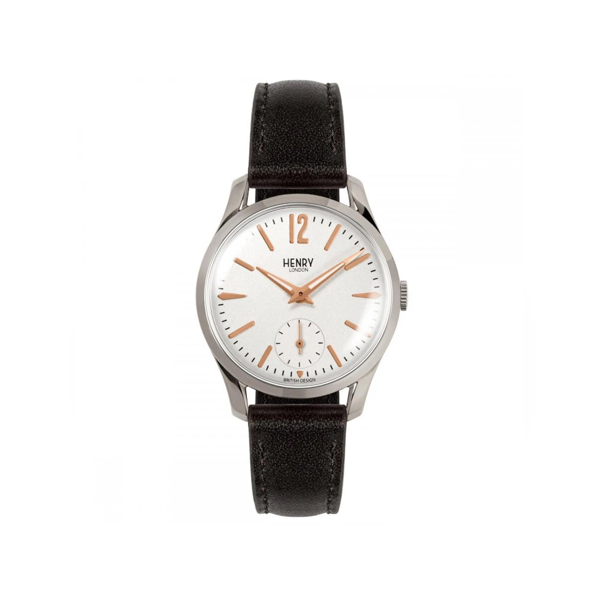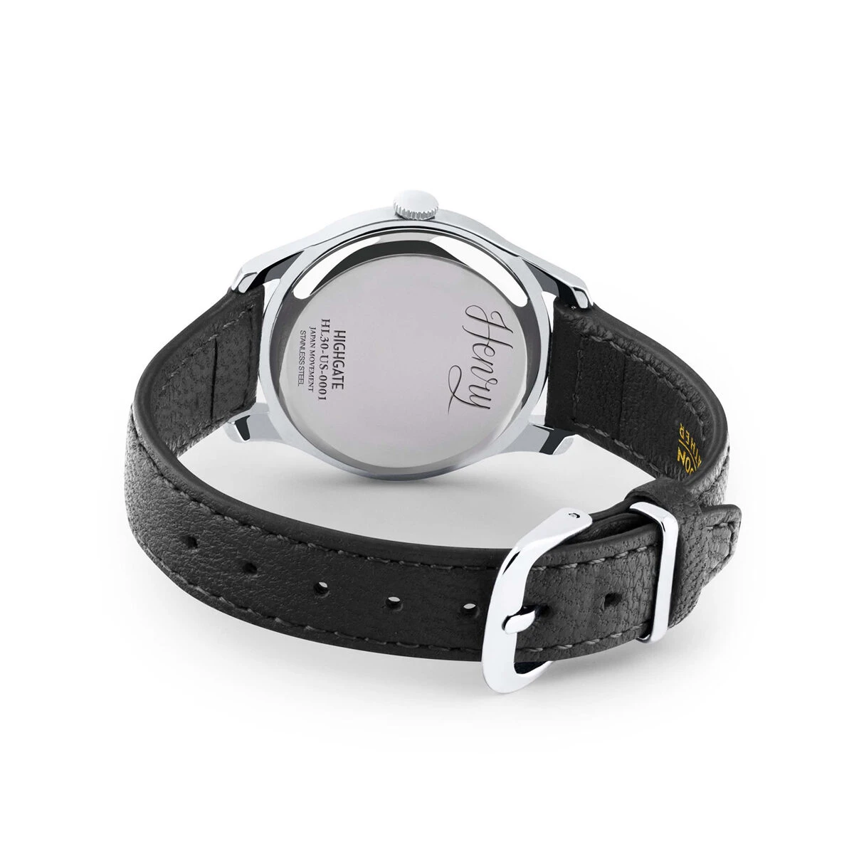 Slim ladies engraved watch from Henry London. This beautiful timepiece features light and sophisticated styling with black leather strap, white dial and silver case. Gold batons and hands bring a balance of colour, creating a contemporary ladies watch of quintessential British styling.