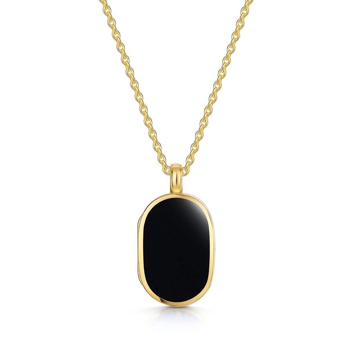 This small dog tag locket and chain from LOVELOX is a compact and refined piece crafted from 925 sterling silver plated with 18K gold and features a black onyx gemstone, known for its properties for strength and stamina. properties.