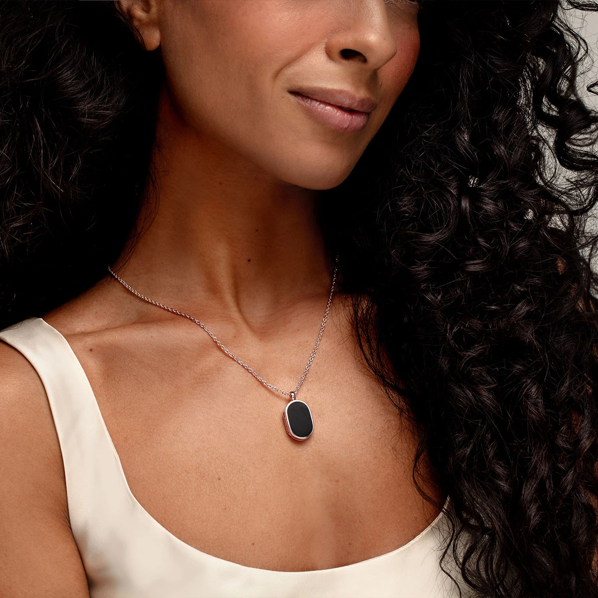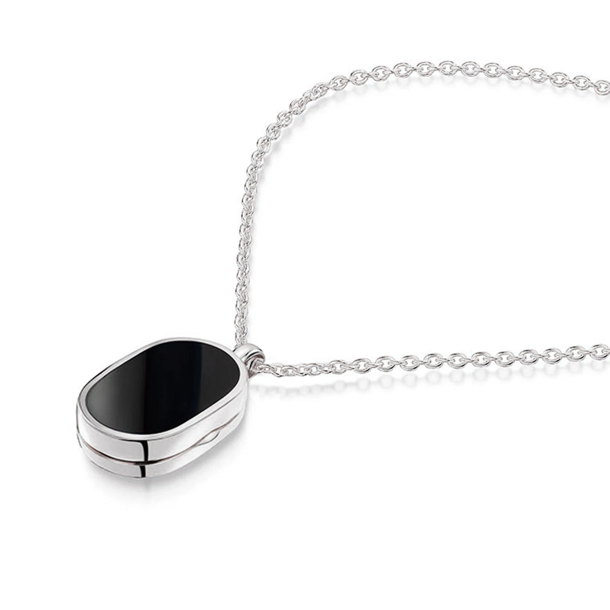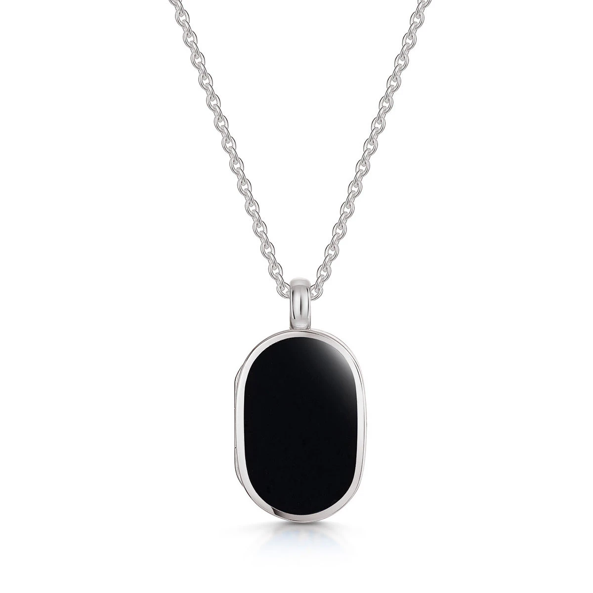 This small dog tag locket and chain from LOVELOX is a compact and refined piece crafted from 925 sterling silver and features a black onyx gemstone, known for its properties for strength and stamina. properties.