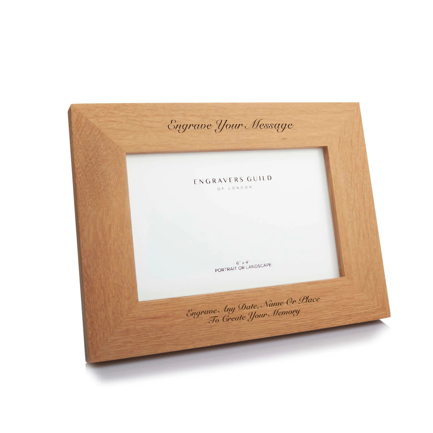 Solid oak photo frame to fit a 4×6 printed photo. Ideal for any home, this frame showcases traditional workmanship with contemporary styling. Complimentary precision laser engraving brings a beautiful personal touch, and a selection of signature packaging options creates a very special gift experience.