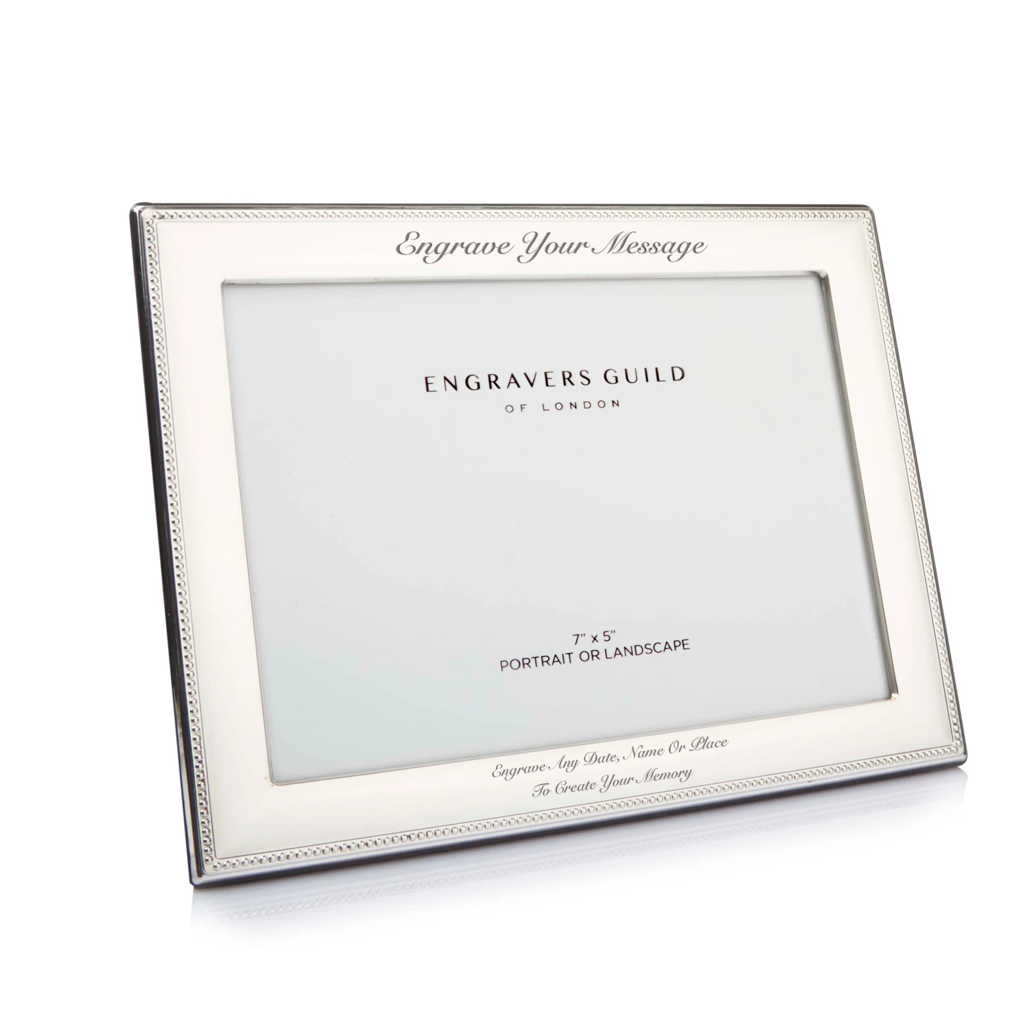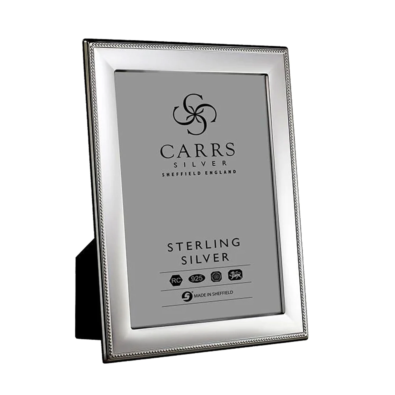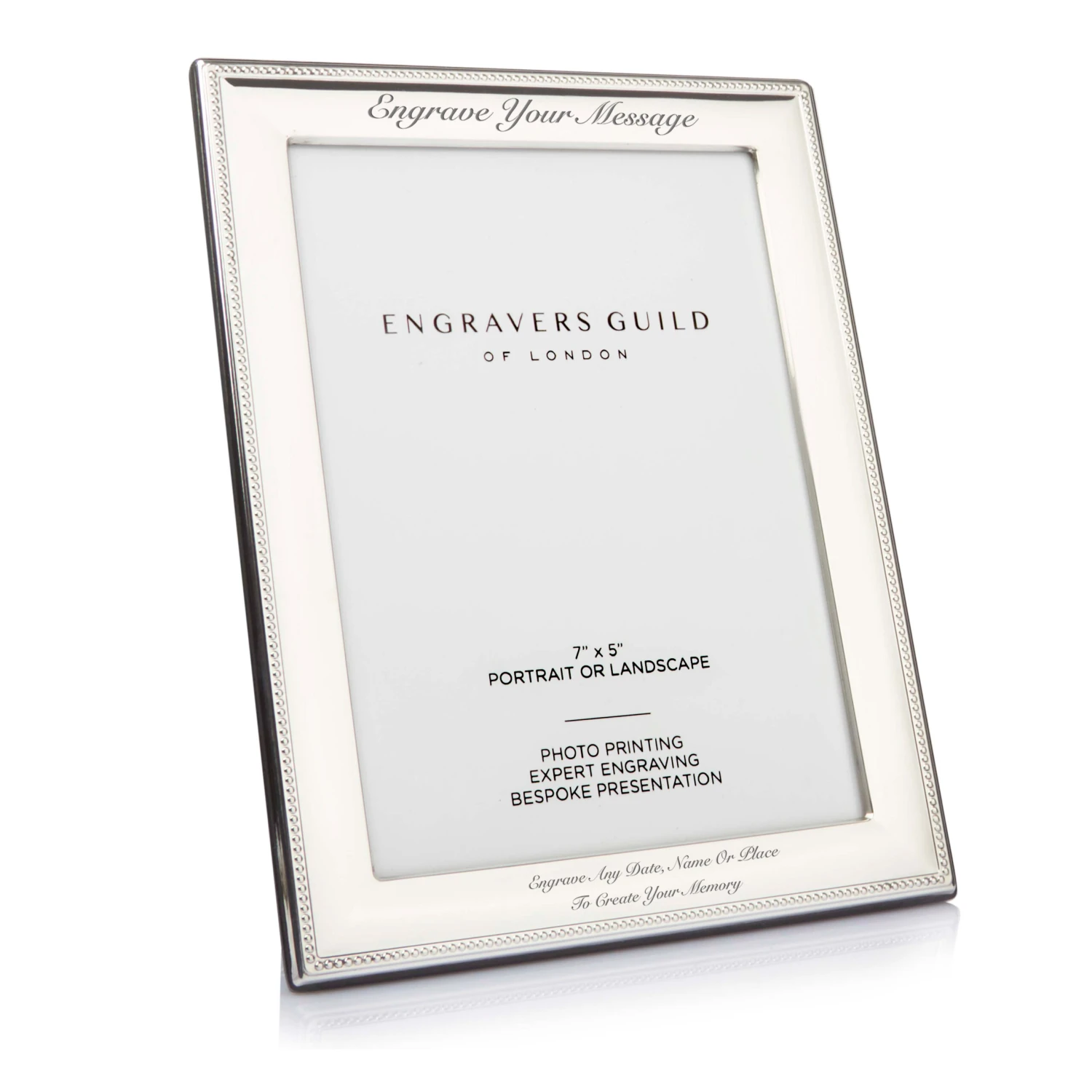 Sterling silver photo frame with a beaded edge, to fit a printed 5×7 photo, manufactured by Carrs Silver. Sheffield England. Showcase your favourite photographs with this sterling silver plain design photo frame with a black wooden back. This frame is completed with a standing strut and can be displayed either portrait or landscape to suit your chosen photo. With the added special message, personalised using precision engraving. this gift is beautifully unique to everyone.