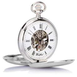 Solid sterling silver pocket watch, with double hunter skeleton case and 17 jewel mechanical movement. A beautiful timepiece from Woodford, speaking to all the sensibilities of a classic English pocket watch. The solid 925 silver twin-lidded case houses an exquisitely engineered precision movement, set against an elegant white outer dial displaying black Roman numerals, period hands and outer-minute indicators.
