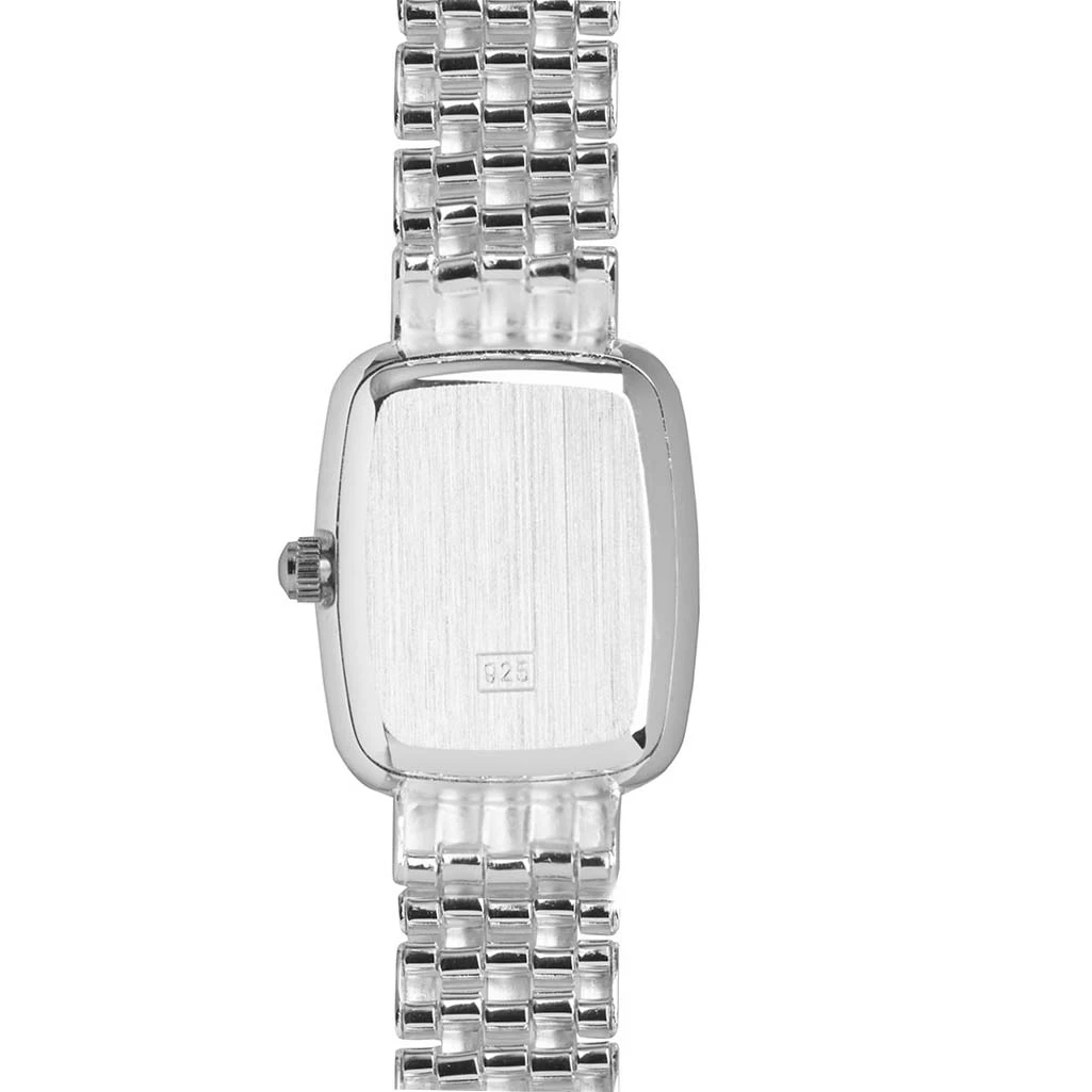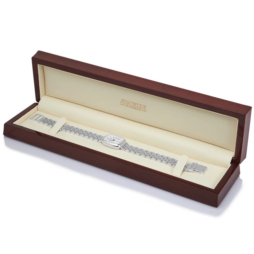 A beautifully crafted ladies sterling silver watch from Jean Pierre. This small elegant watch has a small rectangular shaped white dial with two handed quartz movements and roman numerals surrounding the edge of the dial. This then leads on to a stunning sterling silver polished link bracelet.