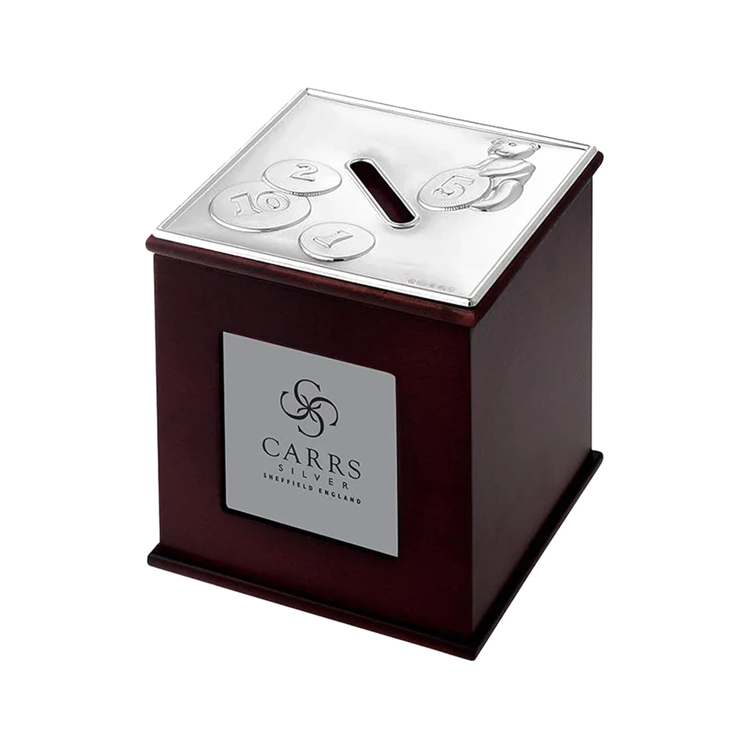 Personalised wooden money box with sterling silver lid and photo frame, to fit a printed 2ร2 photo, manufactured by Carrs Silver. A perfect first money box ideal for a first birthday or Christmas. The silver top can be personalised with precision engraving to create a unique gift for any special occasion.