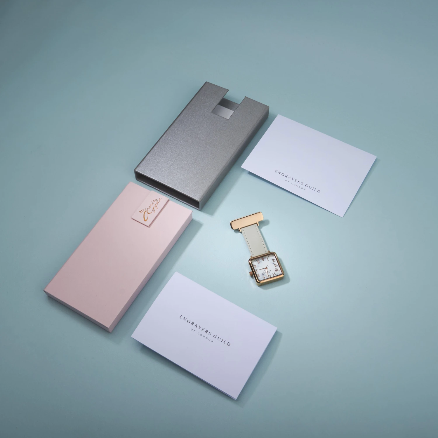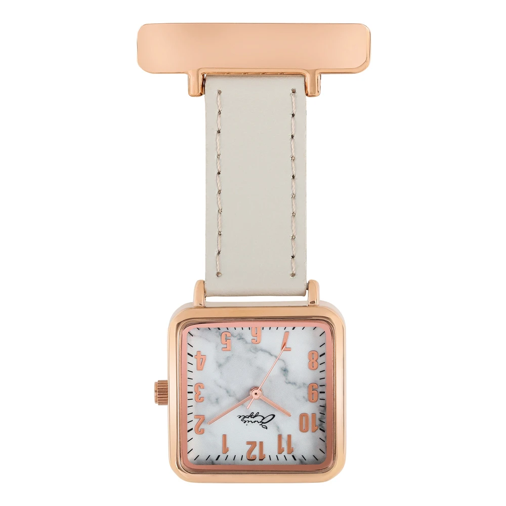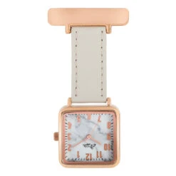 Rose gold nurse fob watch from Annie Apple. This nurse watch features contemporary lines with a unique square case and slimline baton hands. A marble-effect dial offsets the stone leather strap to offer a modern sense of style while the engraving is made with a diamond-tipped cutter and is designed to last forever.