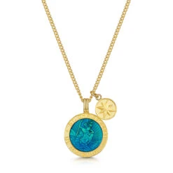A symbol of protection and guidance on life’s great journey, the St Christopher Necklace, Compass Tag, and chain from Clewley are crafted from 925 sterling silver plated with 18K gold. This pendant features the iconic image of St. Christopher set in blue transparent resin with the words “St. Christopher Be My Guide” etched around the rim.