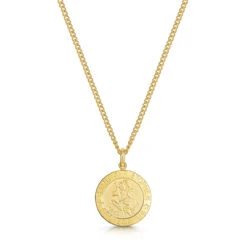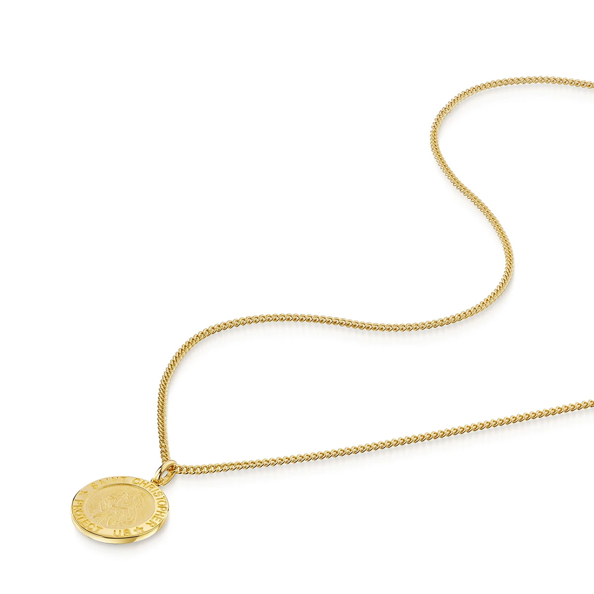 A symbol of protection and guidance on lifeβs great journey, the St Christopher Necklace and chain from Clewley are crafted from 925 sterling silver plated with 18K gold. This pendant features the iconic image of St. Christopher with the words βSt. Christopher Protect Usβ etched on the front.