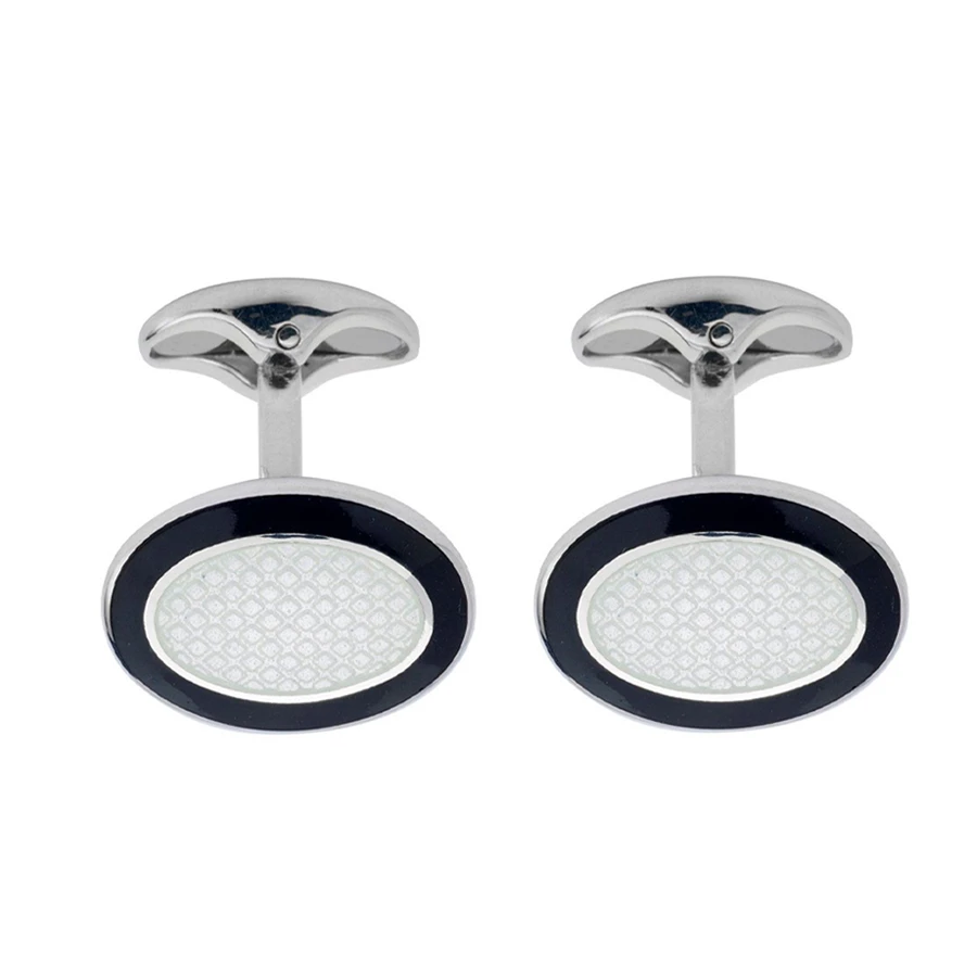 A pair of sterling silver cufflinks, with a black and white enamel design. From Deakin & Francis, these oval enamel cufflinks have a small domed oval spring link fitting, and are attractively, hand-enamelled in a classic black and white. Famously worn by Daniel Craig when playing James Bond, these would look great being worn at black tie events. With complimentary personalisation by Engravers Guild of London with the finest diamond-tipped cutter, this is a special gift which will always be treasured.
