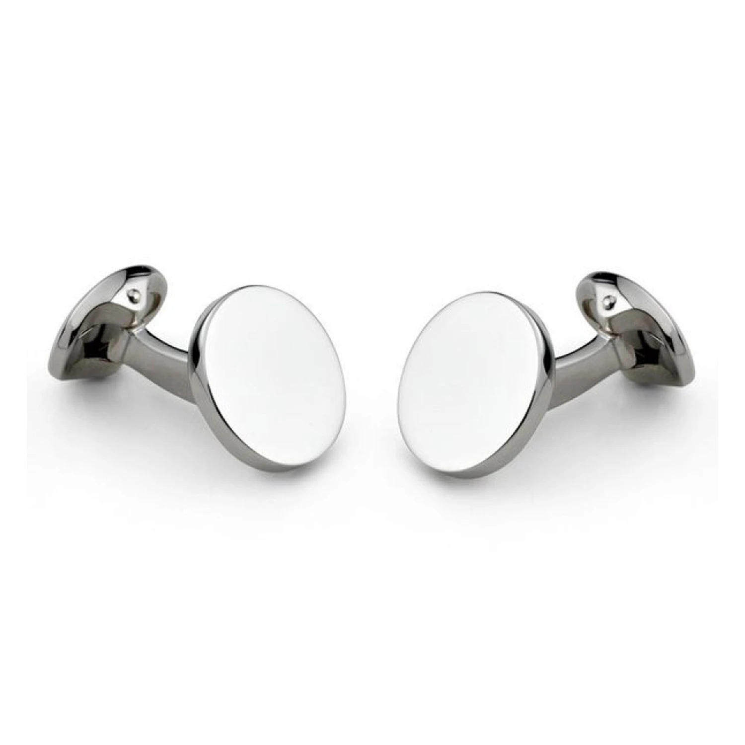 Sterling silver personalised cufflinks in classic round shape from Deakin & Francis. Featuring a brilliantly polished face for a custom inscription, the round cufflinks have a stem fastening with swivel-toggle. The engraving is made with the finest quality diamond-tipped cutter which creates a physical impression in the metal, producing an effect which will keep its lustre indefinitely.