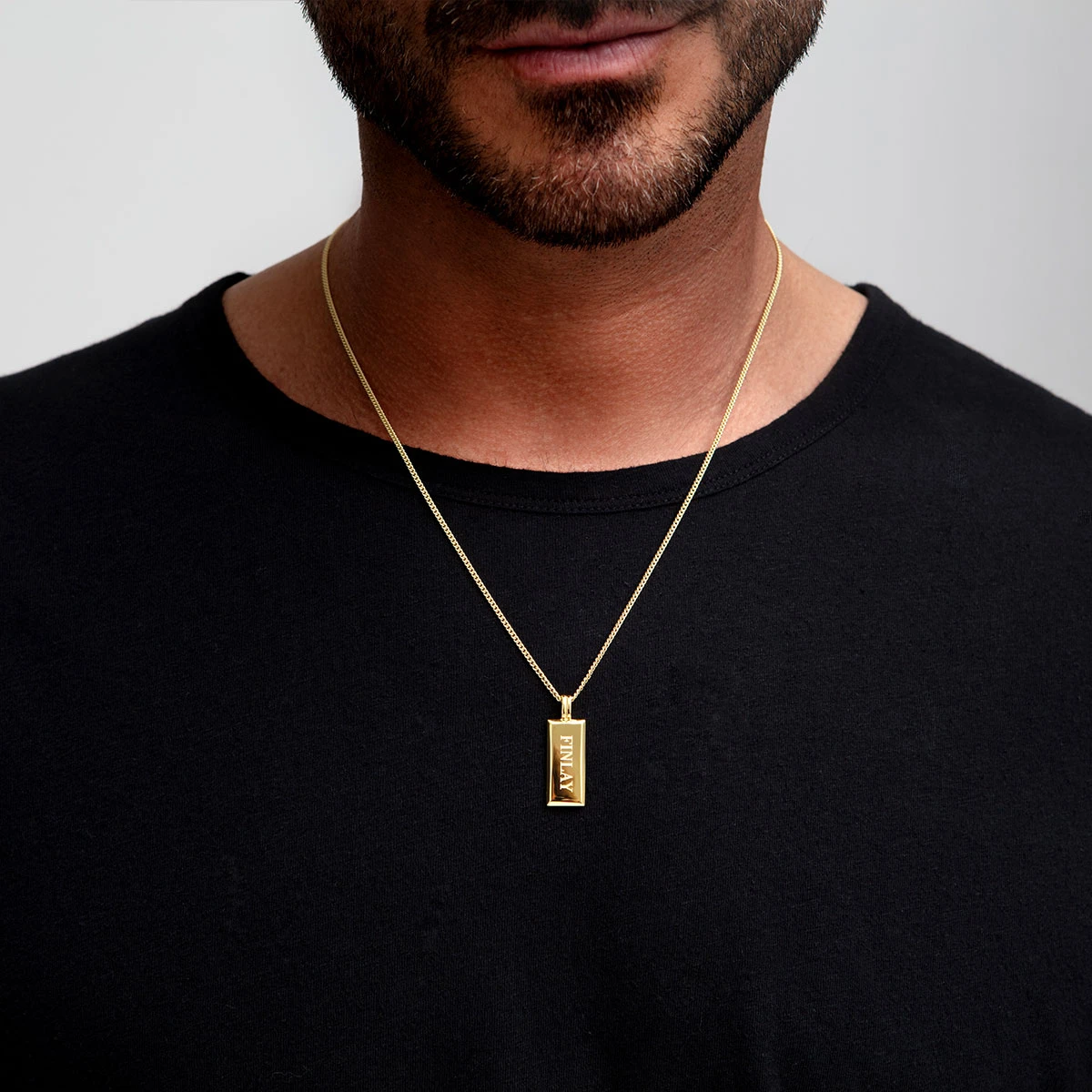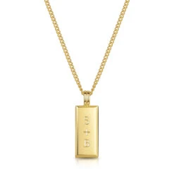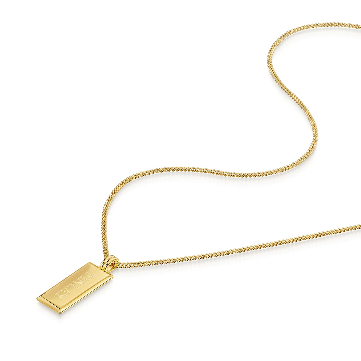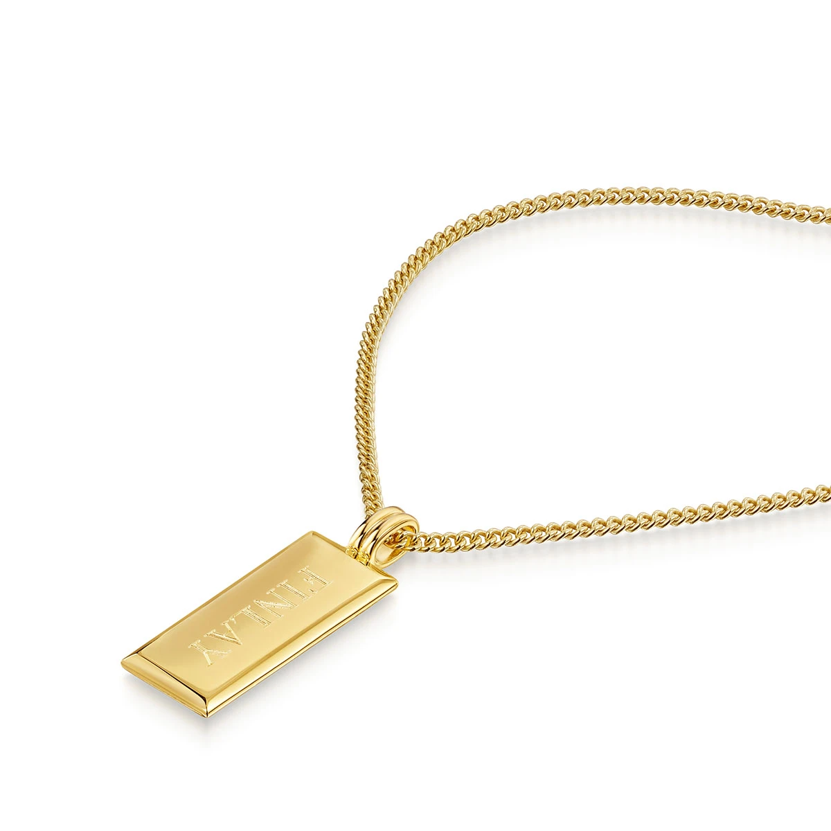 A blend of sleek sophistication and masculine elegance, the Tall Ingot Tag Necklace and chain from Clewley are crafted from 925 sterling silver plated with 18K gold. This pendant boasts soft edges and a curved shape on both sides, ensuring a refined look from every angle.