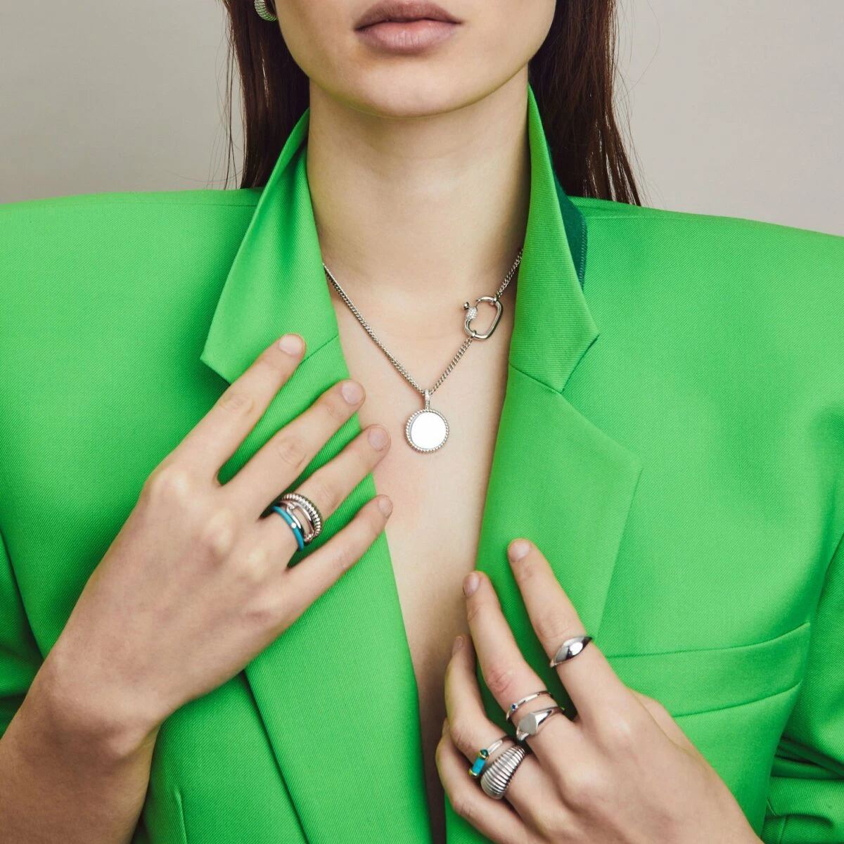 The gold and silver engraved necklace is rhodium plated for extra shine. The disc measures 20mm in diameter and the chain length is 42cm (16.5 inches).