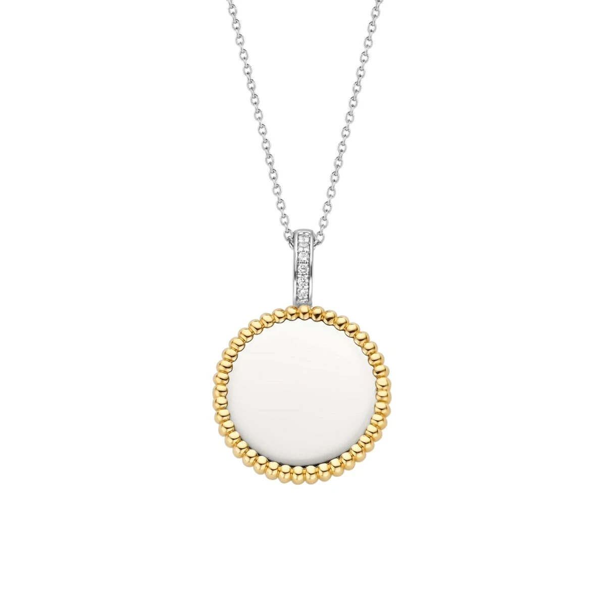 Gold styled necklace from TI SENTO with a refined sun shape. This elegant piece from the eponymous Italian jewellery house is designed specifically for engraving. Its clip-eye is handset with six shimmering white cubic zirconia pavé crystals, with the shape inspired by the rays of sun. The diamond-cut engraving brings a special personal touch.