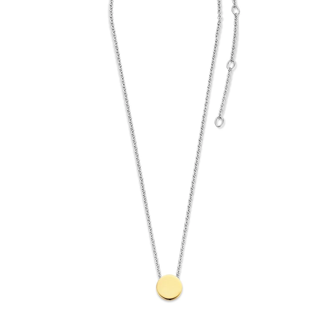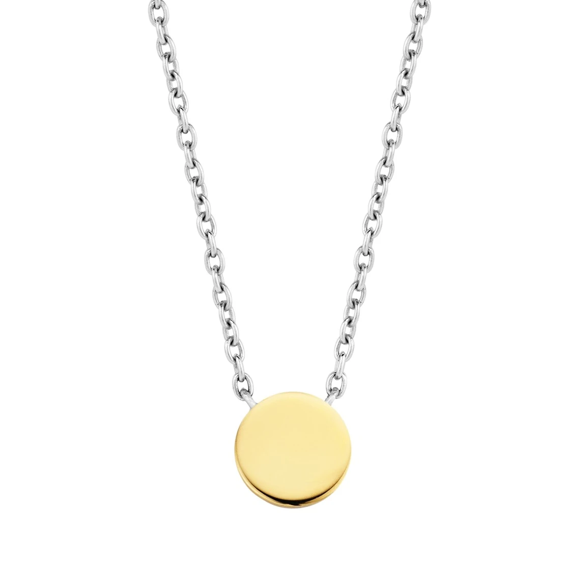 Gold disc necklace from TI SENTO. This simple piece from the eponymous Italian jewellery house is designed specifically for engraving. Pared back to the essential elements, the piece consists of a small 18K gold plated solid silver disc hanging from a substantial silver chain. The engraved necklace is perfect to be worn on its own or layered with other pieces, while the diamond-cut engraving of a single initial also brings a special personal touch.