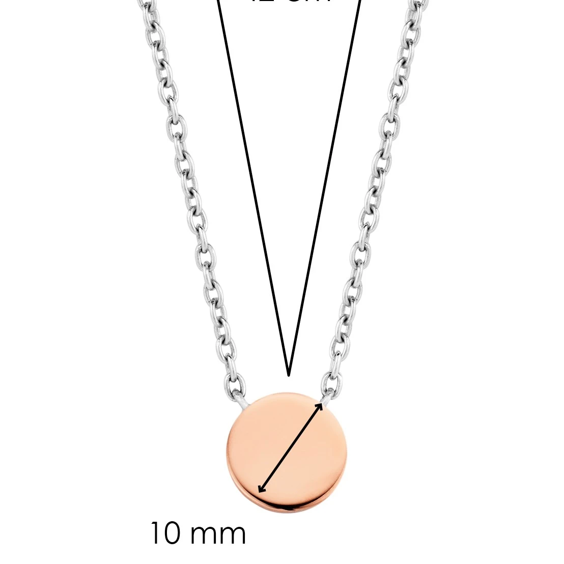 The rose gold engraved necklace is rhodium plated for extra shine. The disc measures 10mm in diameter and the chain length is 42cm (16.5 inches).
