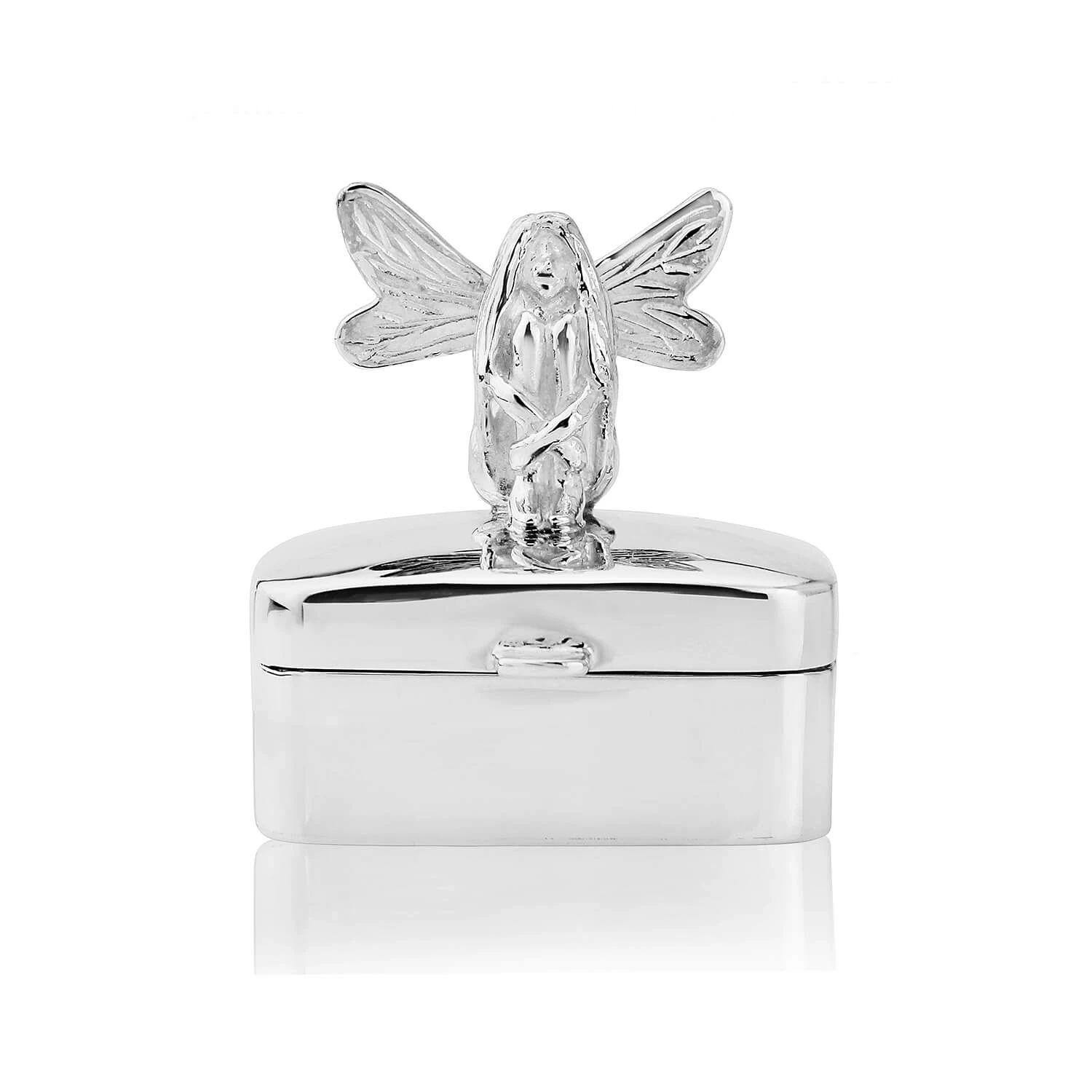Exquisite sterling silver trinket box, with hand-finished silver Tooth Fairy atop ready to do business with milk teeth. Beautifully packaged gift presentation box makes it a memorable gift for a Christening. Gift measures 1 inch high and 1 inch across.