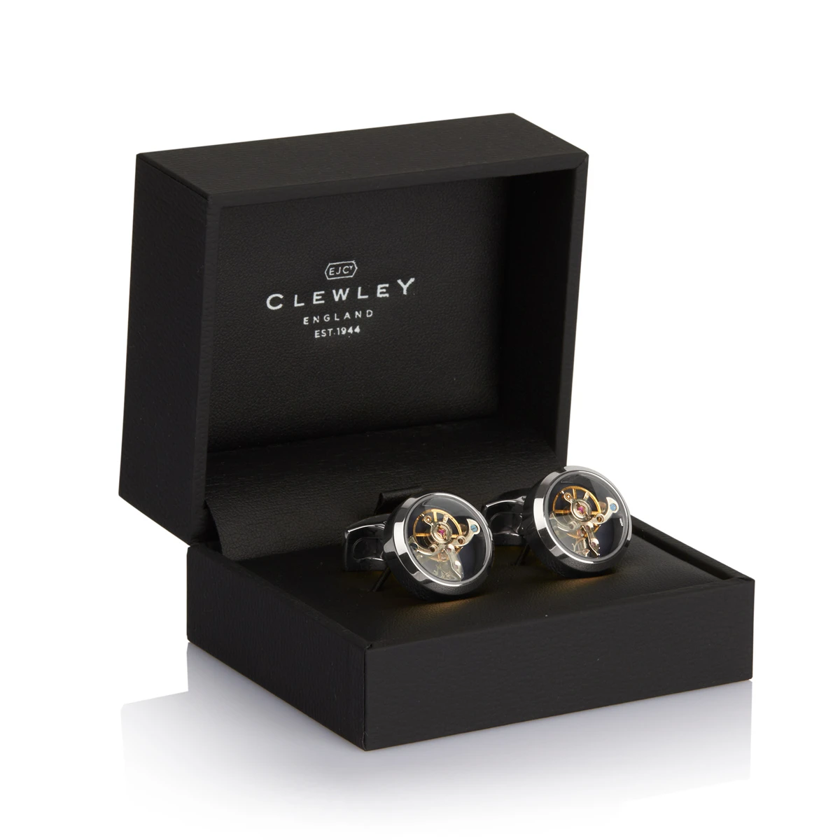 Stainless steel silver cufflinks featuring a tourbillon movement. Inspired by the mechanism devised in 1795 that counters the Earth’s gravity on the isochronal properties in watch movements, these cufflinks impress with their design and engineering. The engraving sits on the inside fastening, creating a very special gift.