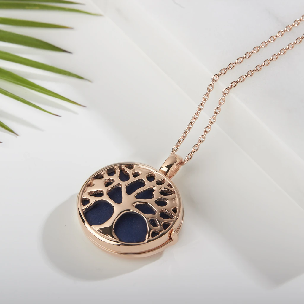 Tree of Life engraved locket in 925 sterling silver with rose gold finish from LoveLox. Representing the connectedness of all forms of creation, this locket reinterprets the ancient symbol with wonderfully clean lines and contemporary styling. Commonly depicted across cultures and faiths from all over the world, this universal image denotes wisdom, enlightenment, growth and strength, bearing positive associations for the wearer.