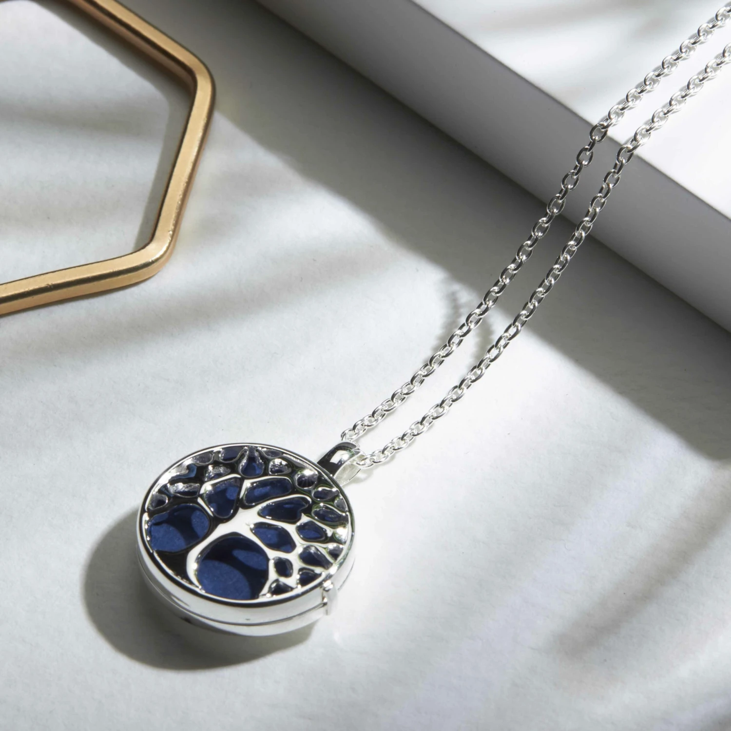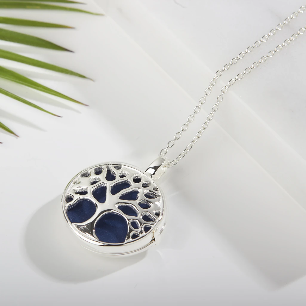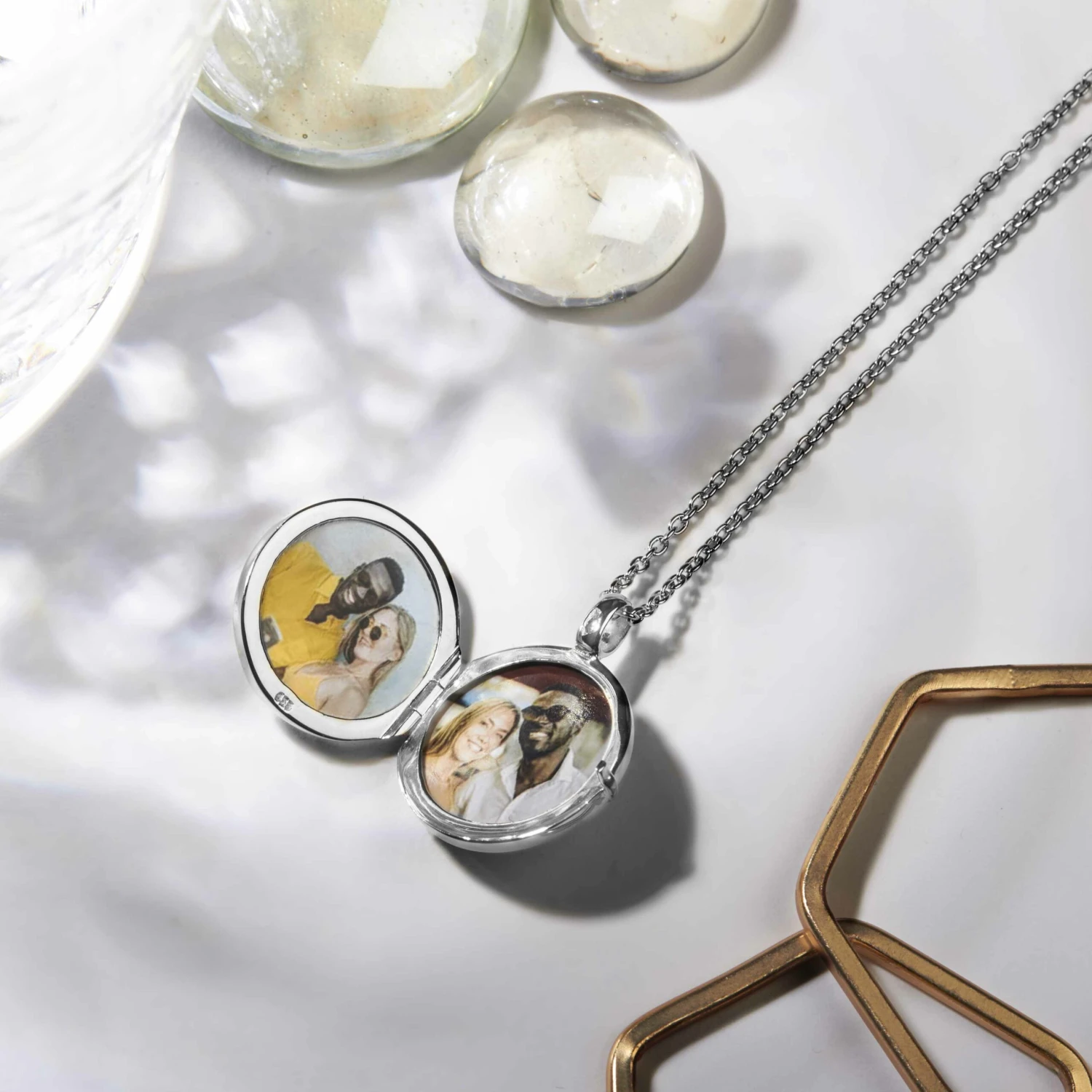 The custom silver locket necklace measures 19mm in diameter, and the solid silver chain has an adjustable length of either 16 or 18 inches.