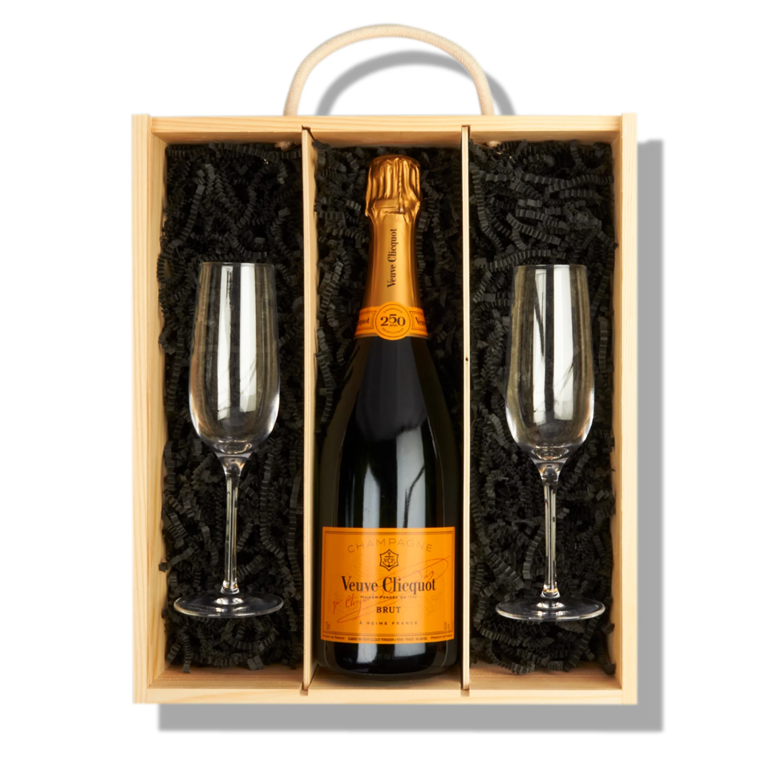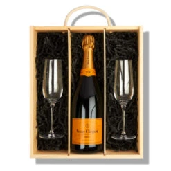 Your wooden gift box includes: 2x Dartington Crystal personalised champagne flutes, 1x Veuve Clicquot Champagne (750ml), 1x wooden crate box