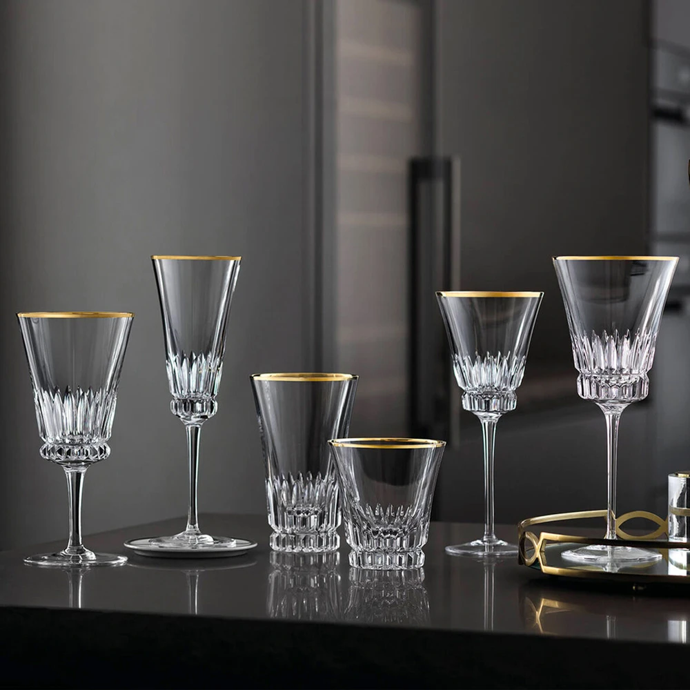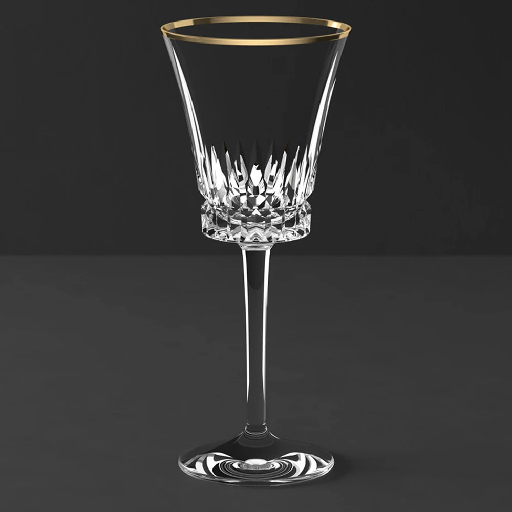 The Grand Royal Gold collection combines crystal glass cut artistically with an extravagant gold rim to create a contemporary yet stylish whole. The special design of this superlative goblet teases out even the finest flavours of a wine, no matter whether a Burgundy, Dornfelder or a strong Nero d’Avola. Precision laser engraving finishes the item, creating a very special gift.