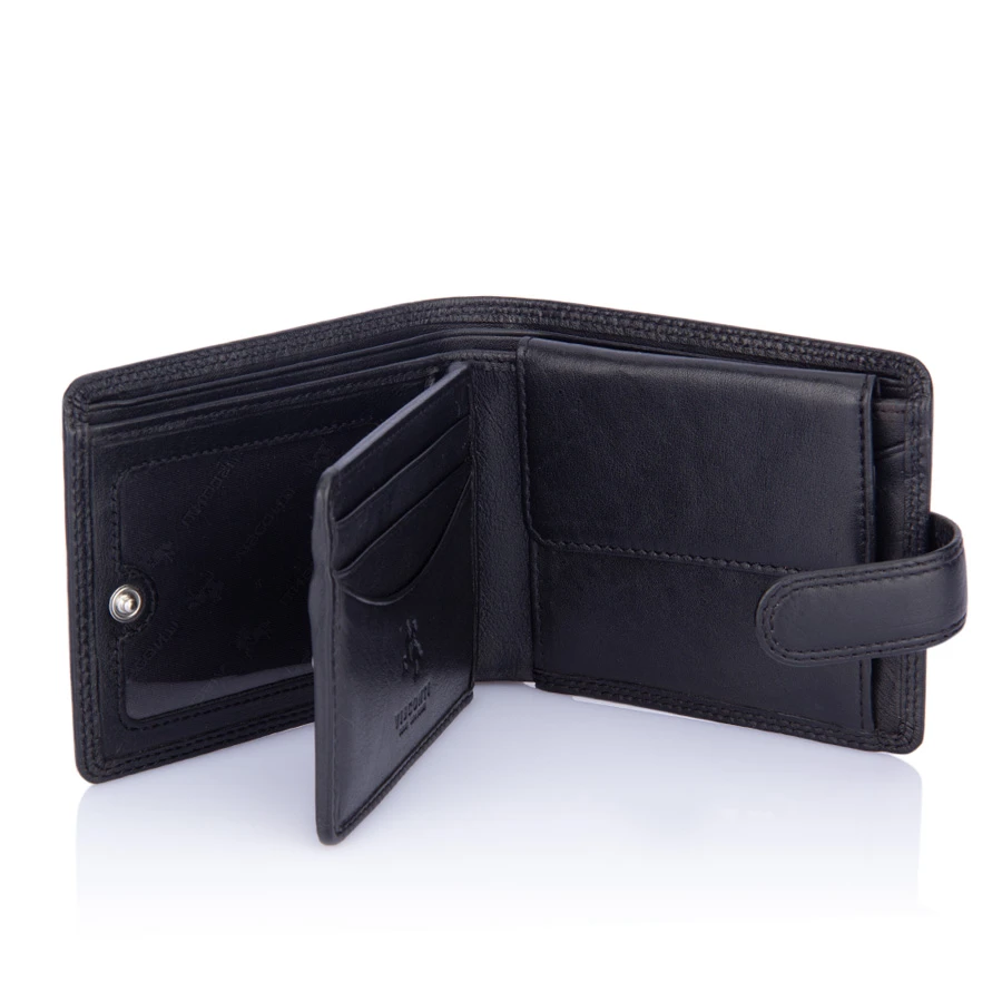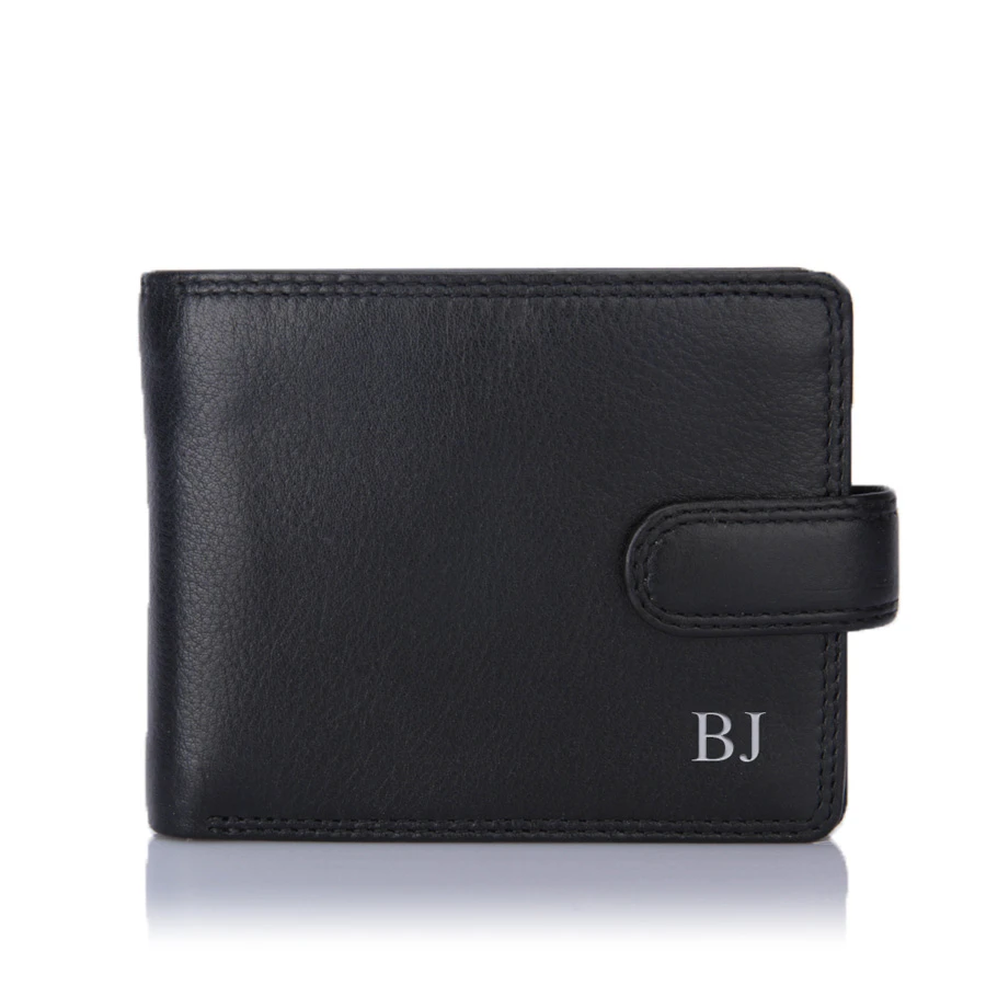 Premium black leather wallet, personalised with complimentary gold, silver or blind embossed initials. This custom wallet draws on London sensibilities and is designed for a life in the capital city. It features extensive compartments, including six credit card slots, a split note compartment, an ID window, three slip compartments and a button close coin pouch. The personalised wallet features RFID protection to keep personal data safe, and a Visconti lining is used throughout.