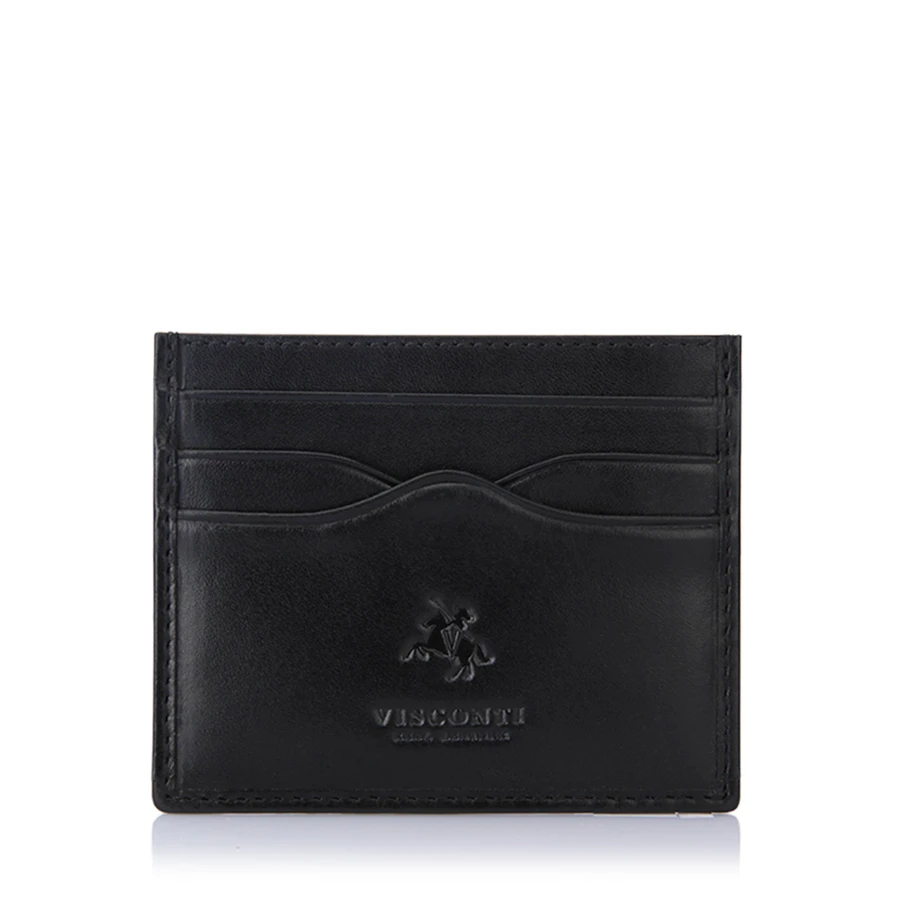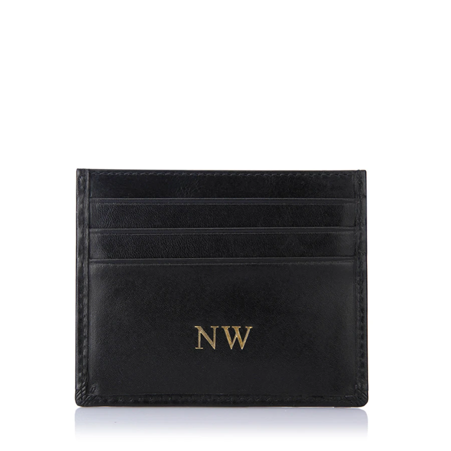 Black leather personalised card holder from Visconti, embossed by Engravers Guild of London with either gold foil, silver foil or blind. This slimline card holder offers six credit card pockets and a central slip compartment for daily essentials such as notes or coins. Designed to offer a more discrete line when carried in a pocket, this personalised wallet is hand crafted from vegetable tan leather and finished with a luxurious lining.